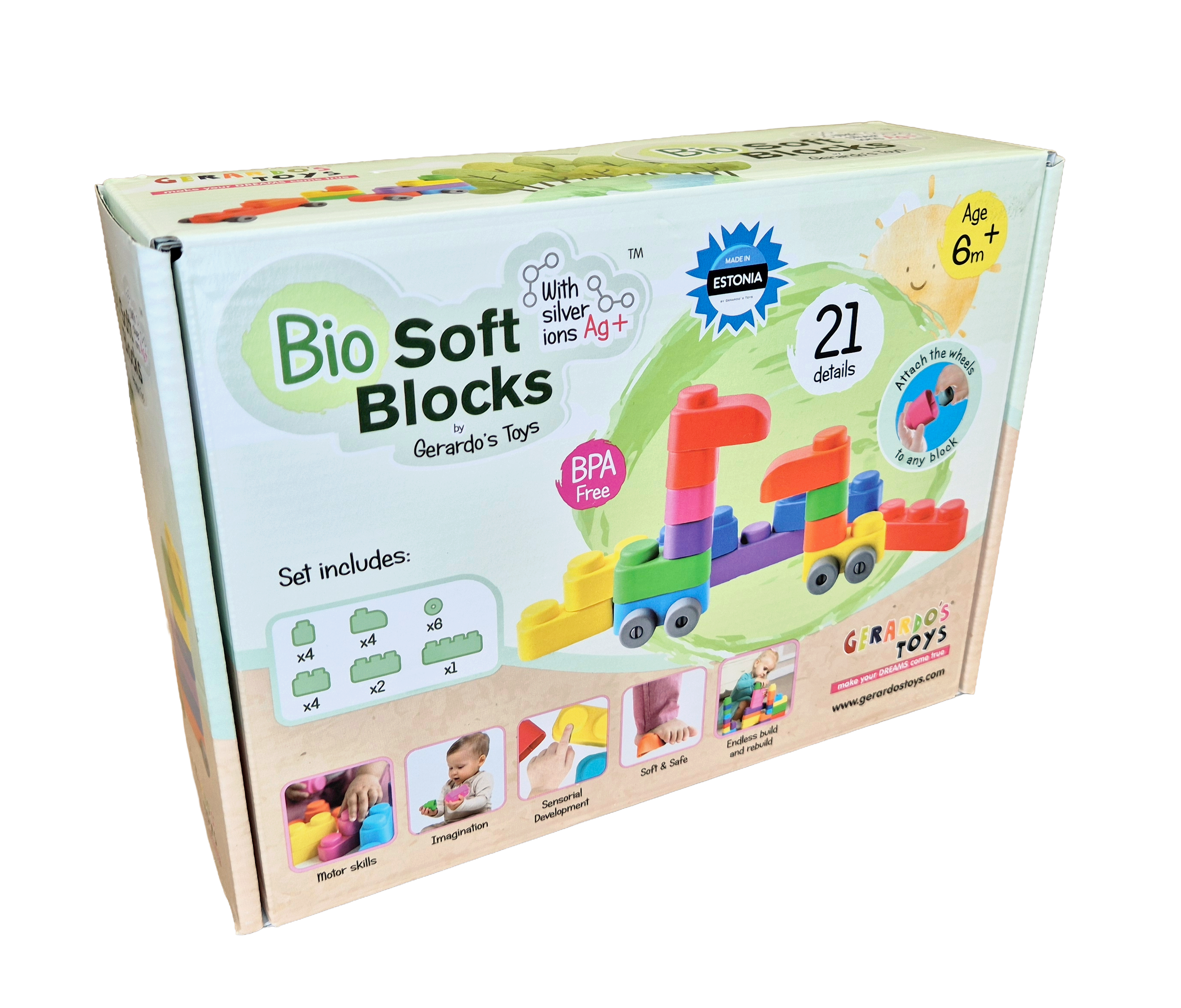 Setul de cuburi moi cu roți Gerardo’s Toys – 21 piese este o jucărie educativă premium, concepută special pentru bebeluși și copii mici (6 luni+), care îmbină joaca sigură cu dezvoltarea timpurie.