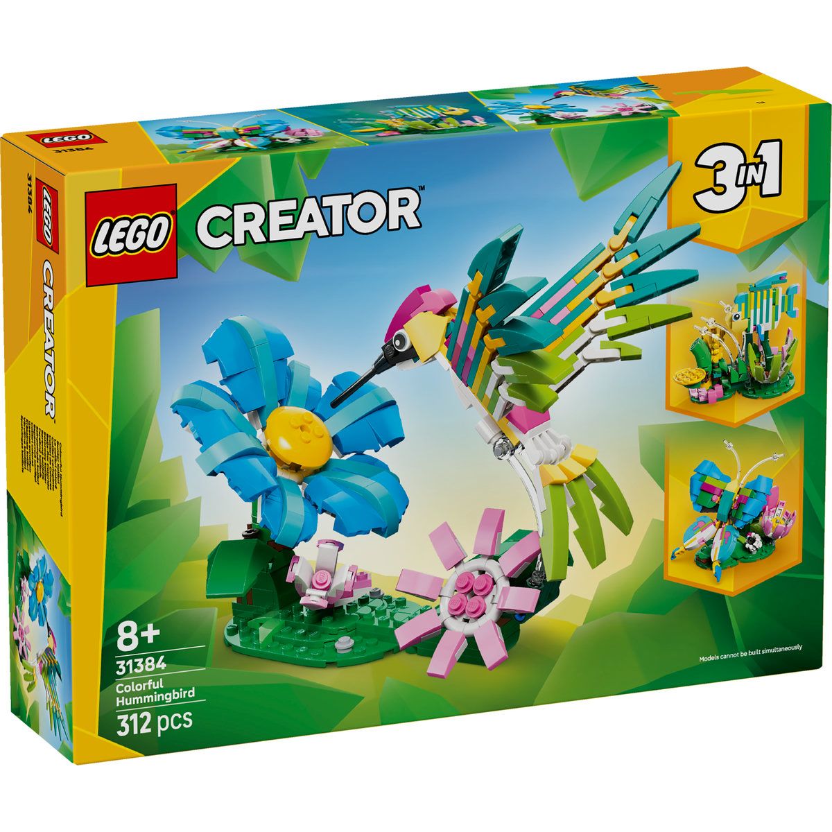 LEGO® Creator 3 in 1 Animale salbatice: Colibri colorat (31384) este un set de constructie creativ, dedicat copiilor de 8 ani si peste care iubesc animalele si natura. Cu acelasi set de caramizi, cei mici pot construi 3 figurine diferite: un colibri articulat, un fluture elegant sau un peste tropical colorat, fiecare asezat pe un stativ decorativ inspirat din natura. Setul stimuleaza imaginatia, creativitatea si joaca fantezista, iar modelele pot fi expuse ca decoratiuni spectaculoase.