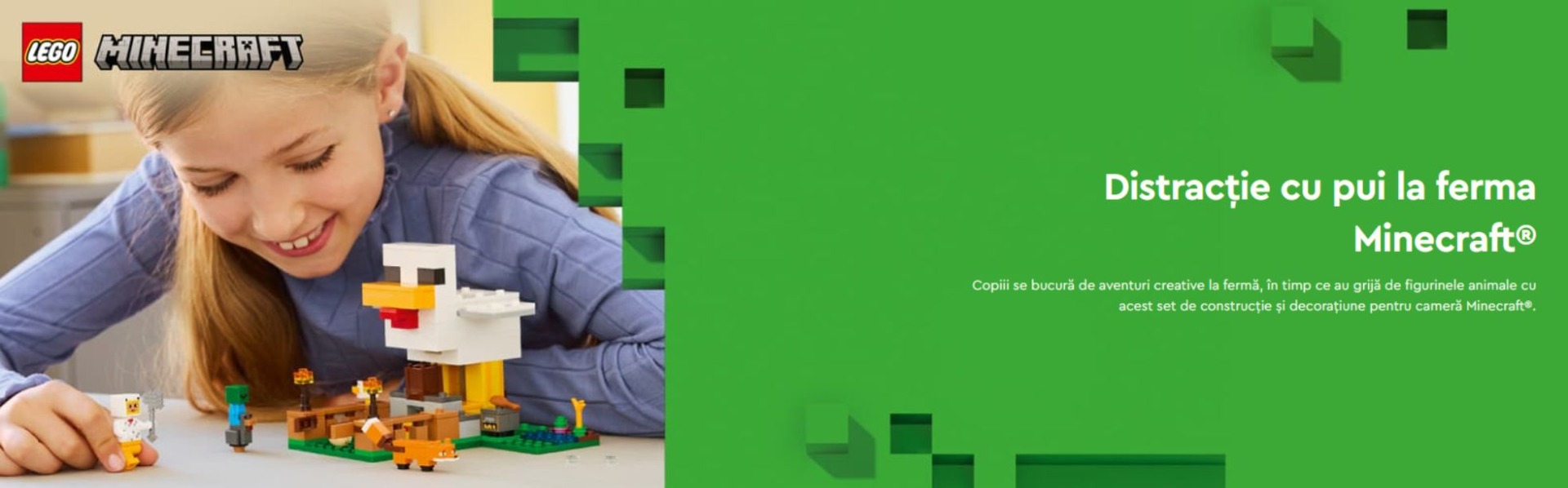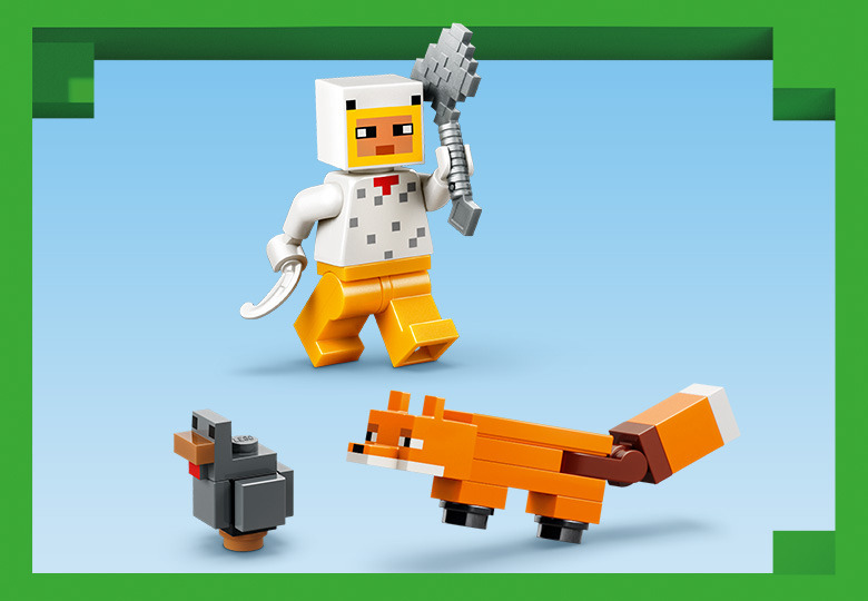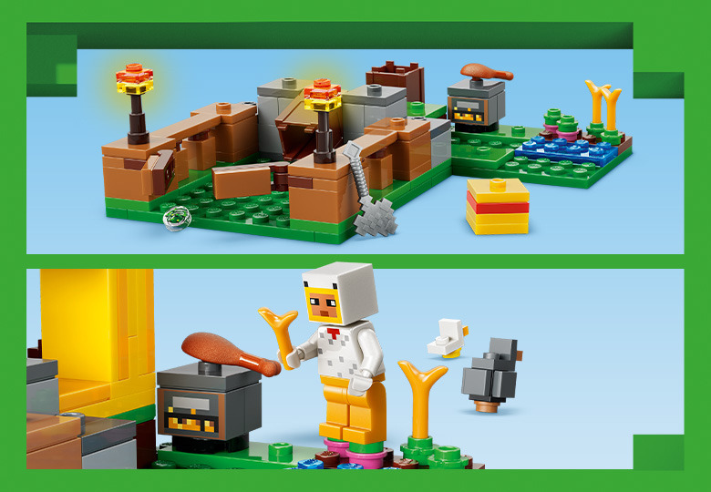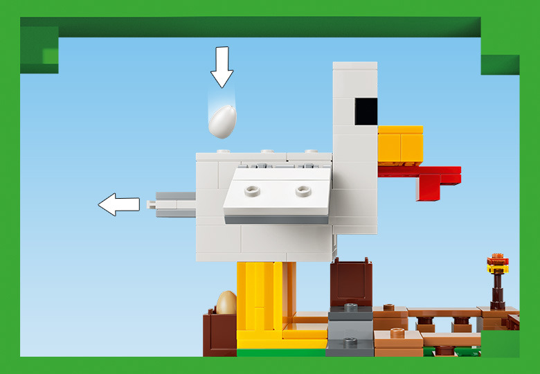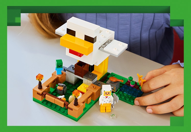 Copiii construiesc un coteț de găini spectaculos, în forma unei găini uriașe, cu funcții interactive, și se alătură minifigurinei Fan al puilor pentru a avea grijă de un pui rece și un pui de găină. Distracția este completată de prezența unei vulpi pofticioase și a unui pui de zombi, cunoscut pentru pasiunea sa de a călări găini – exact ca în Minecraft.