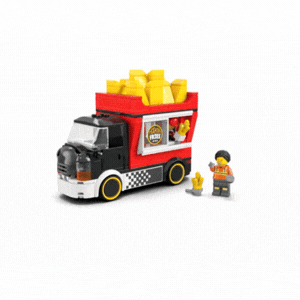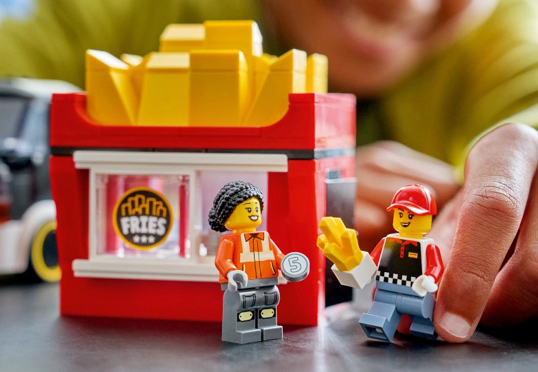 Furgoneta fast-food este echipată cu un chioșc detașabil în forma unei cutii uriașe de cartofi prăjiți, care atrage imediat atenția. Copiii pot scoate acoperișul pentru a accesa zona de preparare, dotată cu friteuză, condimente și o fereastră de servire glisantă. Modelul include și o capotă care se deschide, dezvăluind motorul de jucărie, plus două minifigurine – vânzător și client, pentru joacă de rol realistă.