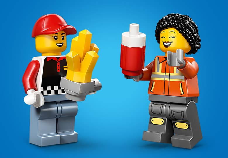 • ACCESORII PENTRU MINIFIGURINE LEGO® – Acest set de joacă cu furgonetă de mâncare pentru copii include accesorii precum o sticluță deketchup de jucărie și o cutie de cartofi prăjiți