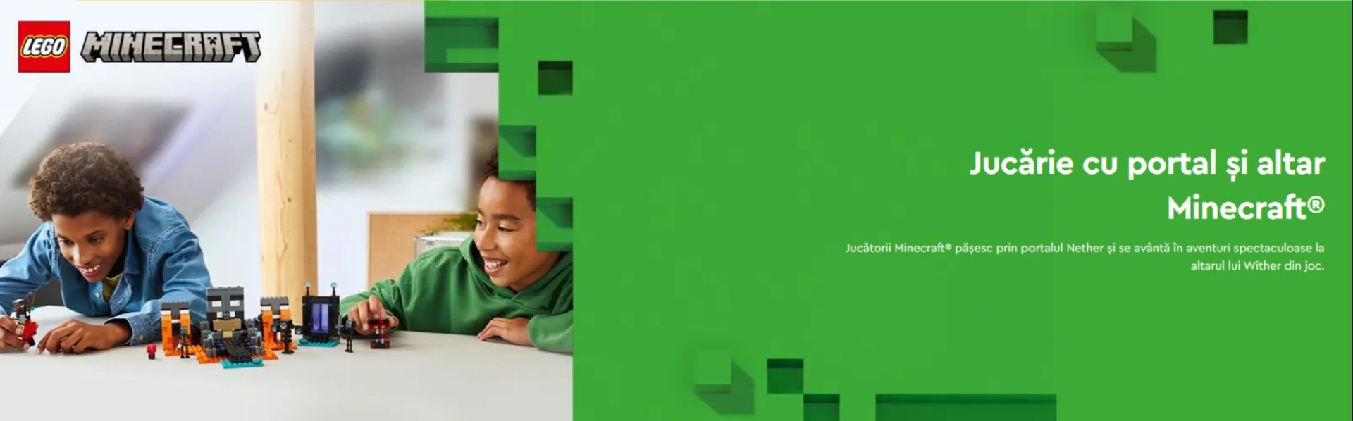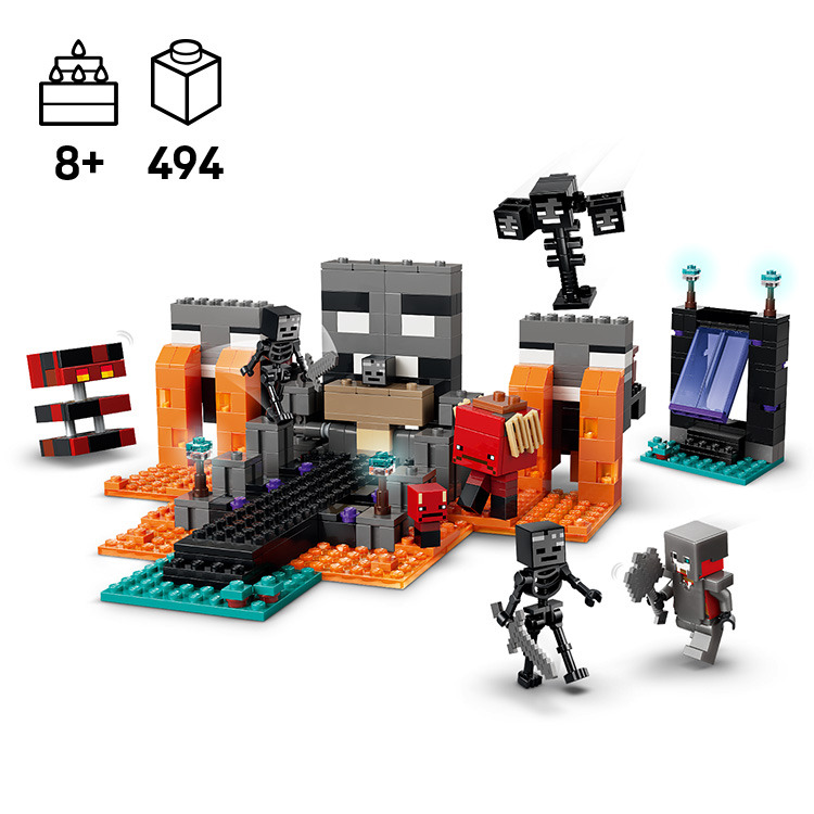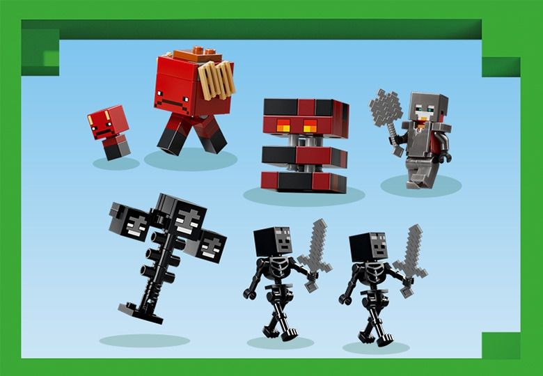 Inspirat fidel din jocul video, setul include o selecție impresionantă de creaturi Minecraft și elemente interactive, culminând cu șeful Wither construibil, care poate fi convocat printr-o funcție specială de explozie. Aventurile devin și mai spectaculoase datorită portalului Nether, altarului cu masă de lucru și posibilității de a călători pe un strider prin mediul ostil.