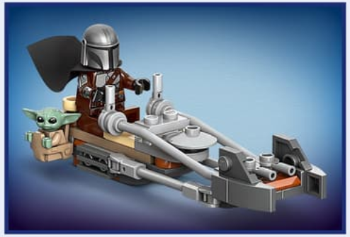 Așază minifigurina LEGO Mandalorian la manșa motocicletei, cu figurina LEGO Grogu alături, în geanta atașată. Prinde pușca explozor a Mandalorianului în spatele vehiculului, pentru a fi gata de acțiune.