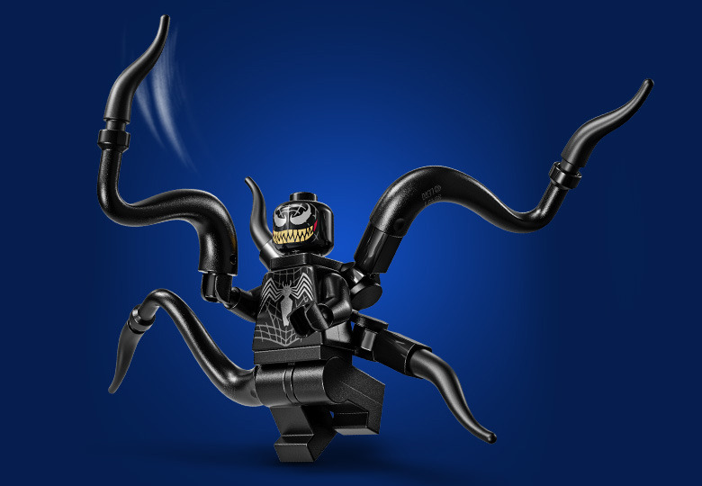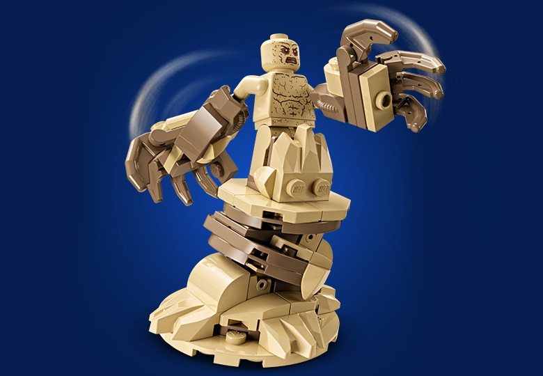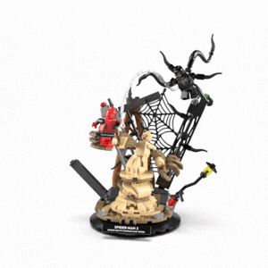 Setul include 3 minifigurine iconice – Omul-Păianjen, Venom și Sandman – și o construcție dinamică, plină de elemente interactive. Omul-Păianjen se balansează spectaculos pe o frânghie din pânză de păianjen, Sandman se ridică din nisip cu un braț uriaș modelabil, iar Venom atacă folosindu-și cele 4 tentacule mobile. Datorită bazei solide cu plăcuță cu nume, modelul poate fi expus ca piesă decorativă sau folosit pentru joacă intensă, prin detașarea personajelor.