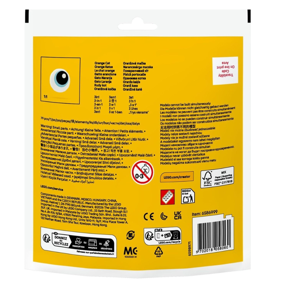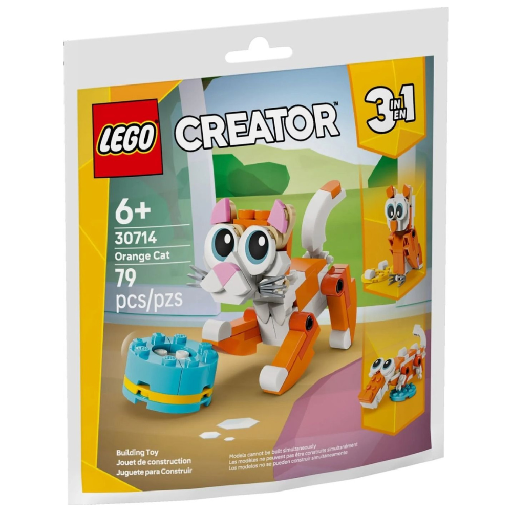 LEGO Creator Pisica Portocalie 30714 este un set 3 in 1 destinat copiilor de 6 ani si peste, care ofera o experienta de constructie creativa si interactiva. Folosind acelasi set de piese, copiii pot construi o pisica portocalie adorabila, un crocodil simpatic sau o bufnita draguta, fiecare model venind cu elemente tematice care incurajeaza joaca imaginativa si povestile creative.