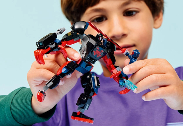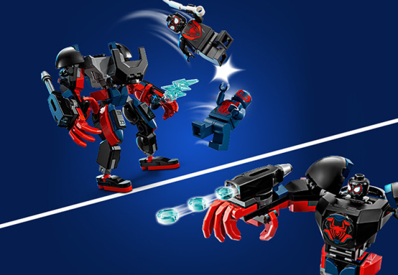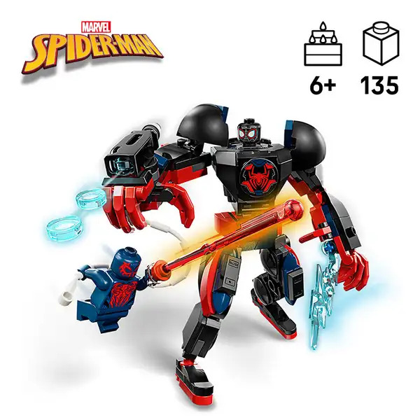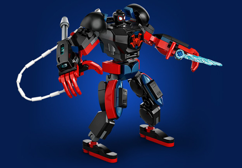 Piesa centrală a setului este un robot supradimensionat, complet articulat, controlat de Miles Morales, ideal pentru joacă de rol intensă. Acțiunea este amplificată de accesoriile de luptă: un lansator detașabil cu 3 piroane, frânghii din pânză de păianjen și arme cu panze electrice. În fața robotului se află Omul-Păianjen 2099, pregătit să contraatace cu o rază laser ținută în mână. Setul poate fi folosit atât pentru joacă, cât și pentru etalare, fiind o alegere excelentă pentru fanii Marvel și Spider-Verse.