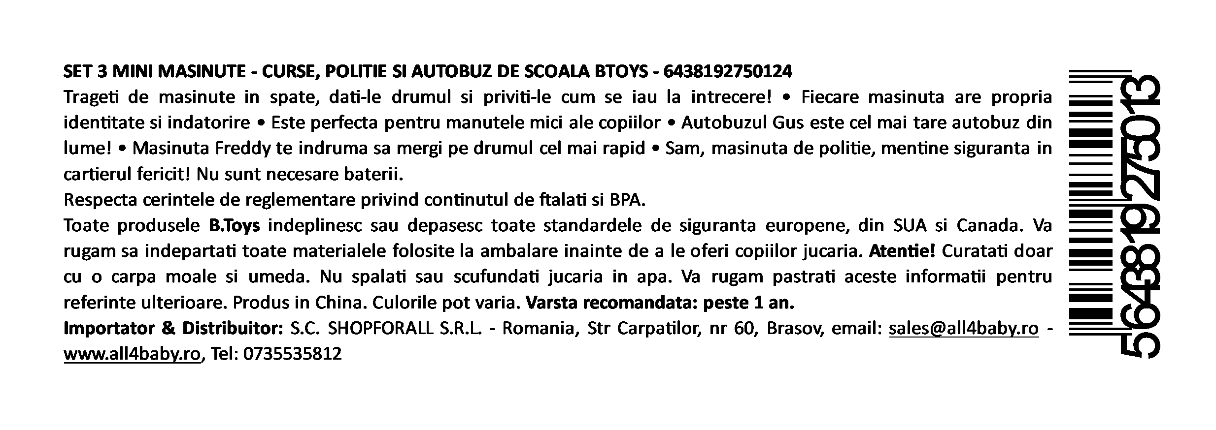 Ultima actualizare a informatiilor de prezentare pentru Set 3 mini masinute, + 1 an, Btoys a fost efectuata la data de 16-04-2026.  |  Raporteaza Descriere Gresita