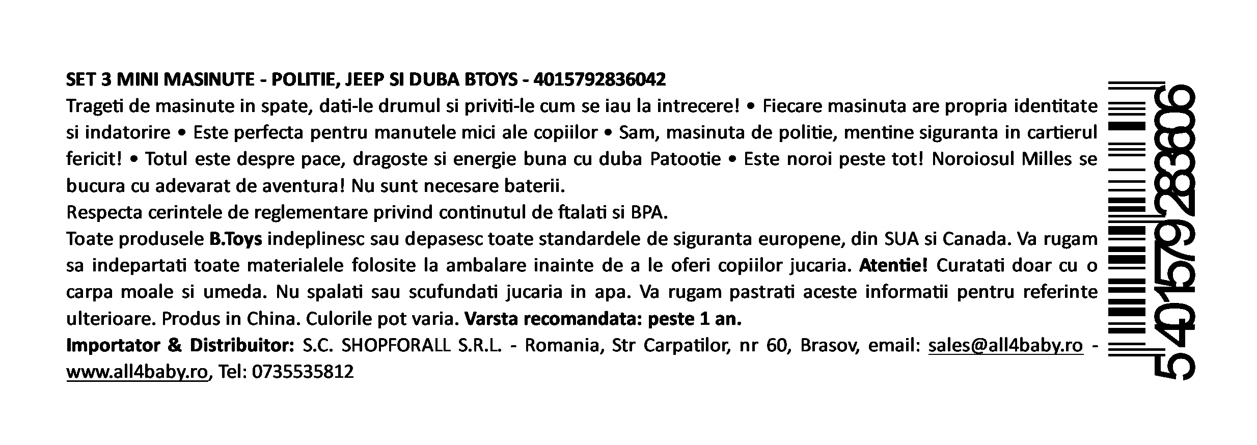 Ultima actualizare a informatiilor de prezentare pentru Set 3 mini vehicule, +1 an, Btoys a fost efectuata la data de 19-04-2026.  |  Raporteaza Descriere Gresita