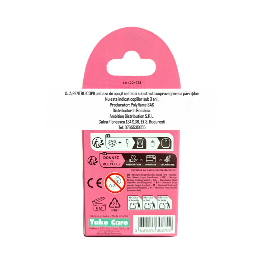 oja pentru unghii pe baza de apa, produs cosmetic pentru pielea sensibila, avand o formula pe baza de apa, usor de indepartat, parfumuri blande, fiind o modalitate distractiva pt copii de a se exprima creativ. Ofera o gama variata de culori, pt a stimula creativitatea si imaginatia copiilor. produs non toxic , vegan