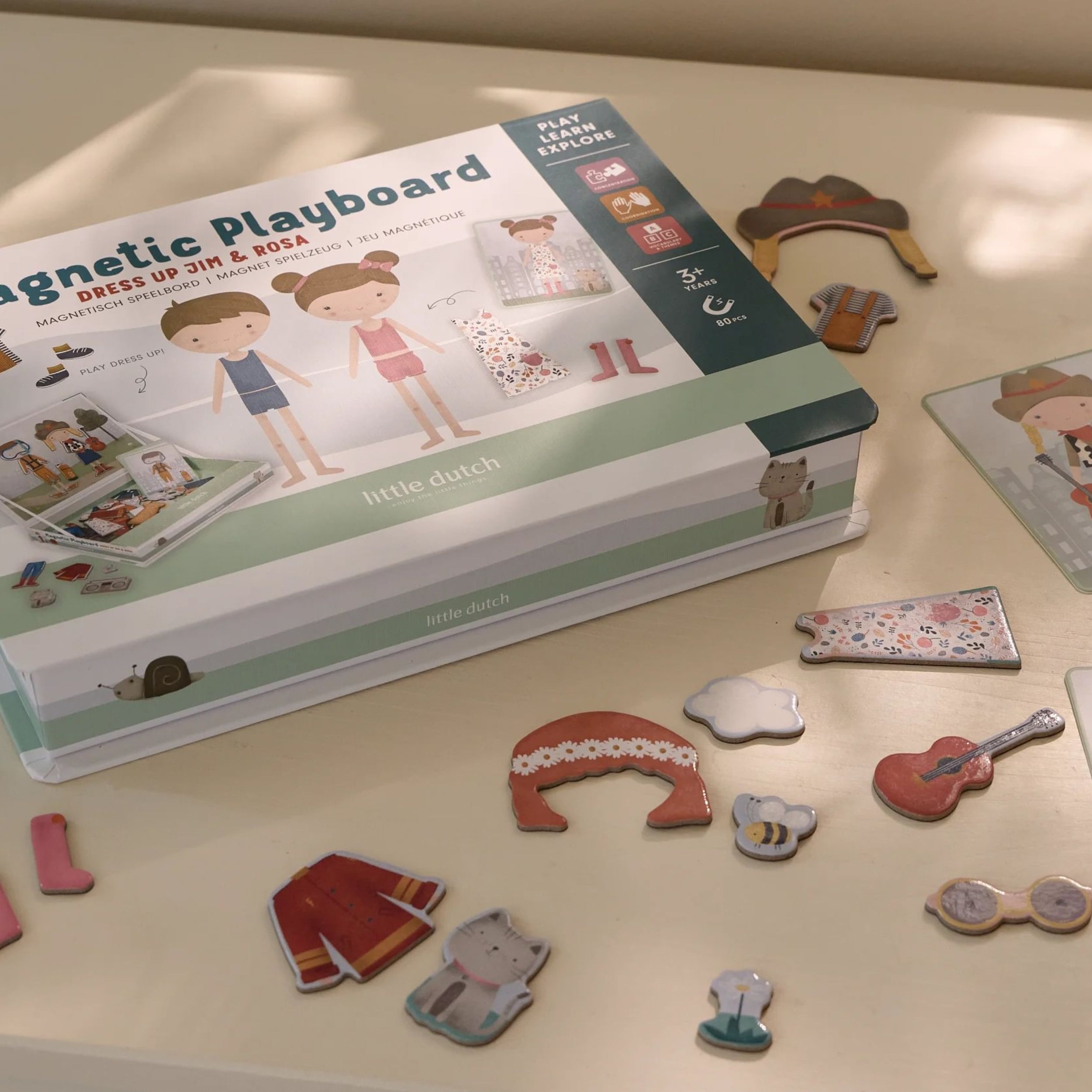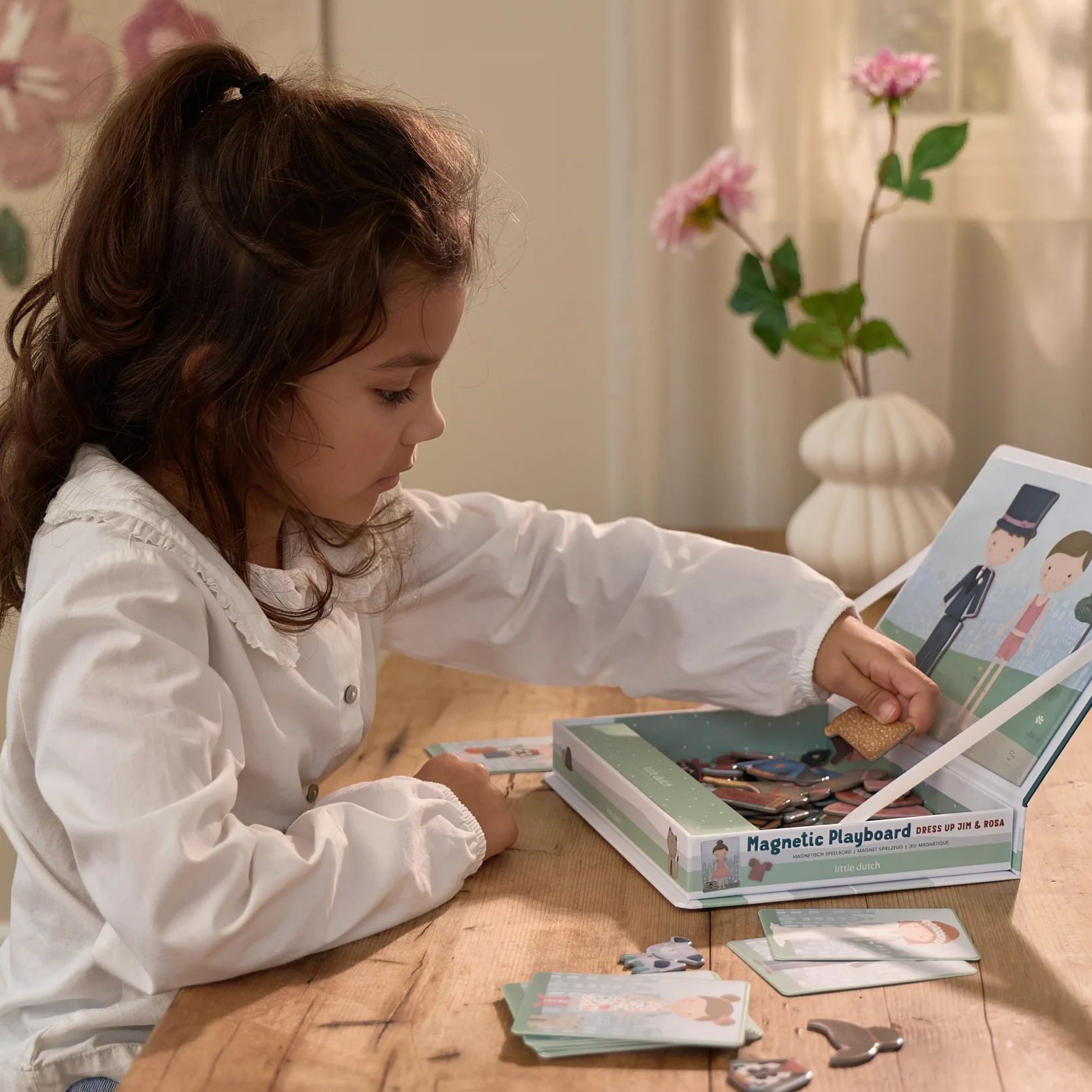 Alege un cartonas cu Jim sau Rosa si imbraca personajele de pe tabla de joc folosind puzzle magnetice sau foloseste imaginatia ta pentru combinatii unice.