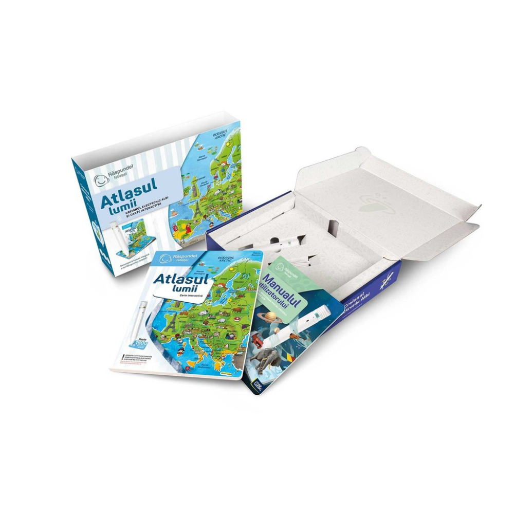 Setul contine: Creion electronic ALBI 2.0, Cartea „Atlasul lumii”, Cablu USB, Manual de utilizare