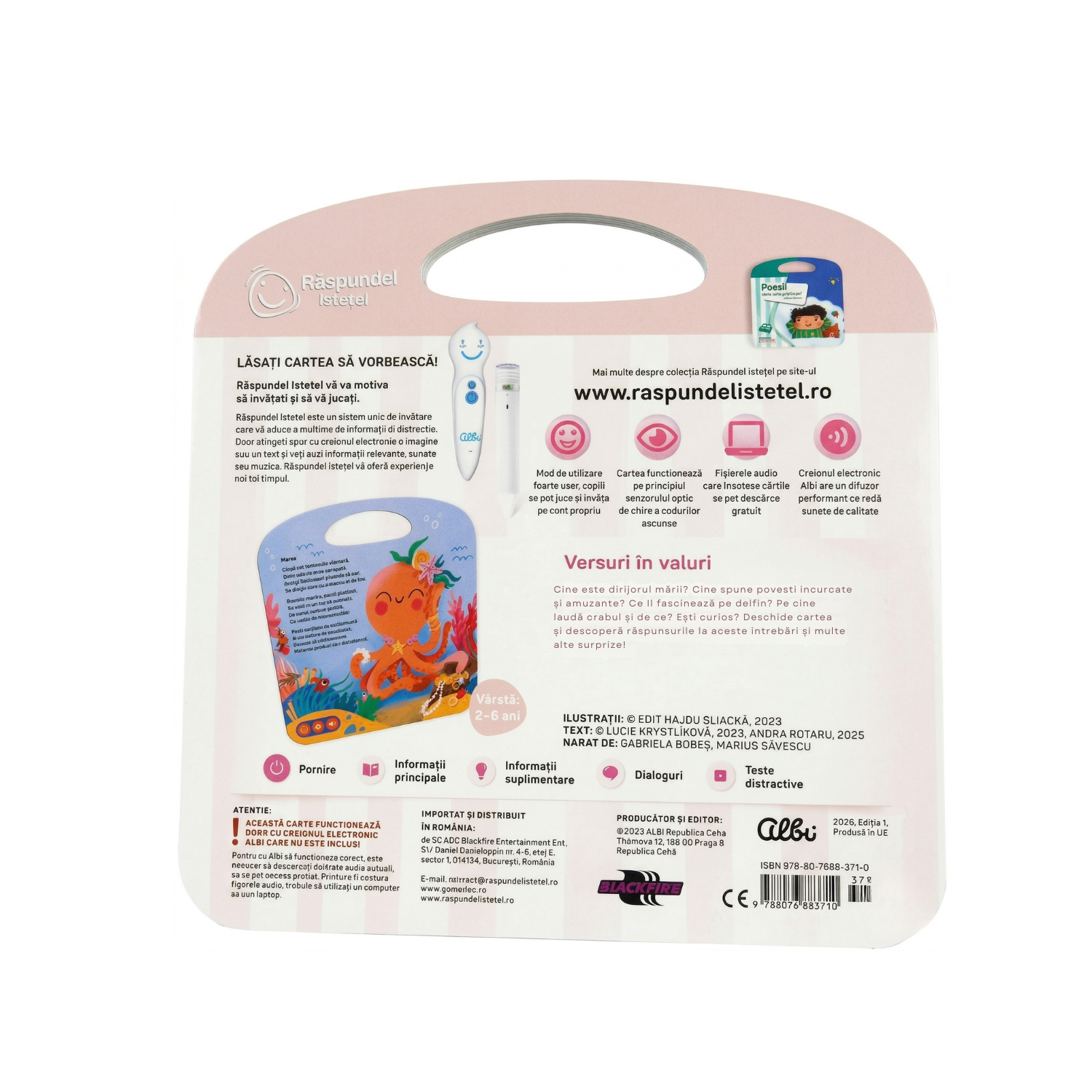 Cartea functioneaza impreuna cu creionul interactiv Albi (se achizitioneaza separat), care transforma lectura intr-o experienta audio-interactiva, oferind raspunsuri, sunete si explicatii.