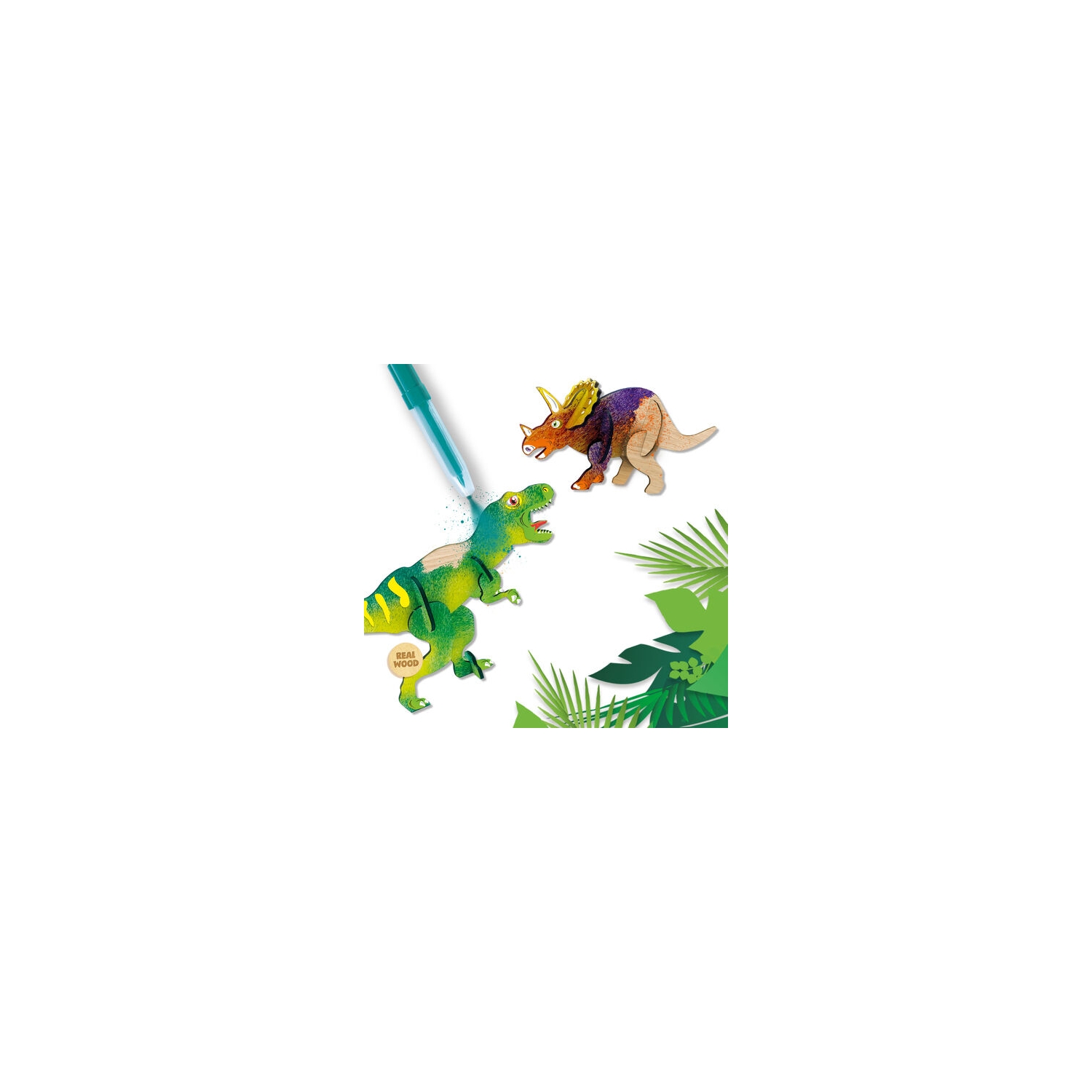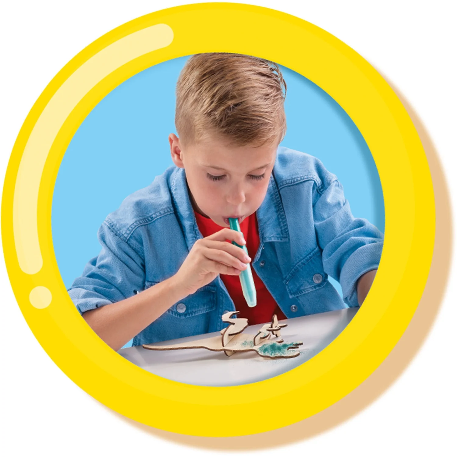 Descoperă distracția creativă cu Setul de carioci cu aerograf și dinozauri din lemn SES CREATIVE! Copiii pot colora piesele din lemn sub formă de dinozauri folosind cariocile cu aerograf, obținând efecte și tranziții spectaculoase de culoare. Activitatea stimulează imaginația, dezvoltă abilitățile motorii fine și coordonarea mână-ochi.
