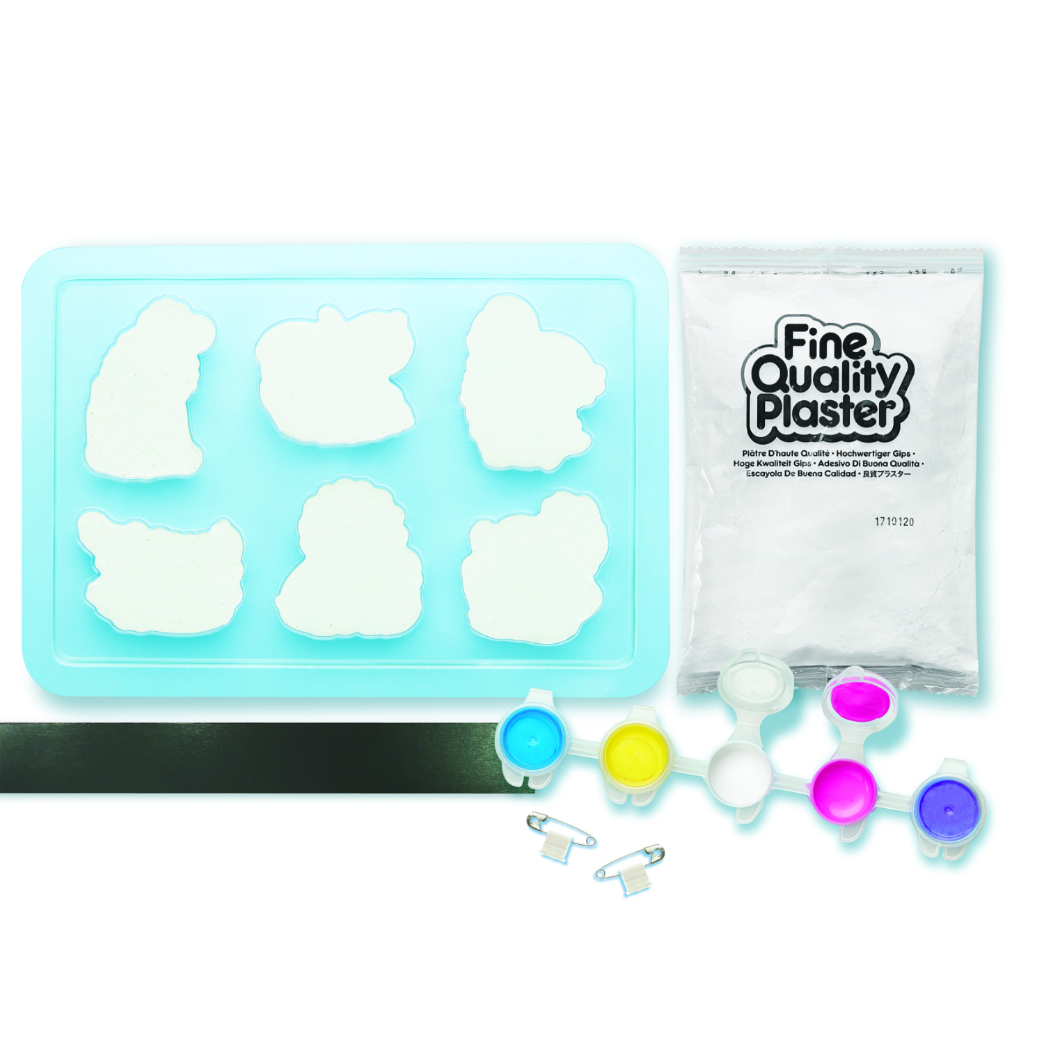 Conținut: matriță cu 6 modele, ipsos, bandă magnetică, 2 știfturi, vopsele (5 culori), pensulă, instrucțiuni.