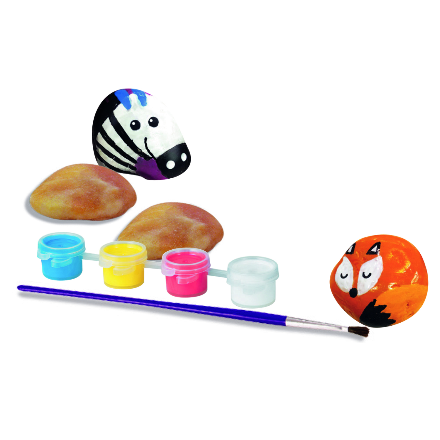 Conținut set: 4 pietre netede, 1 bandă de vopsea, 1 pensulă.