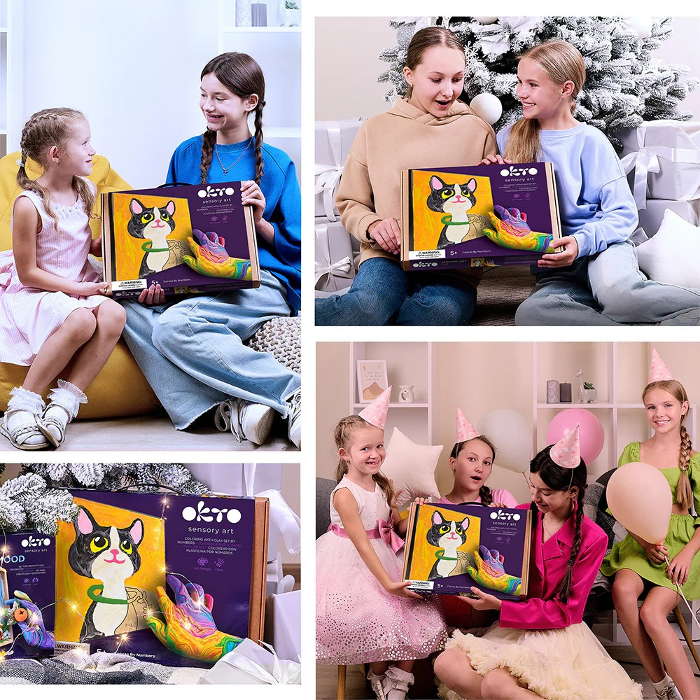 Setul de pictura cu argila usoara OktoClay – Cat este o activitate creativa si relaxanta, ideala pentru copiii care adora animalele. Cu ajutorul argilei moi si colorate, cei mici pot modela un tablou 3D jucaus, in care pisicuta prinde viata prin forme si culori.