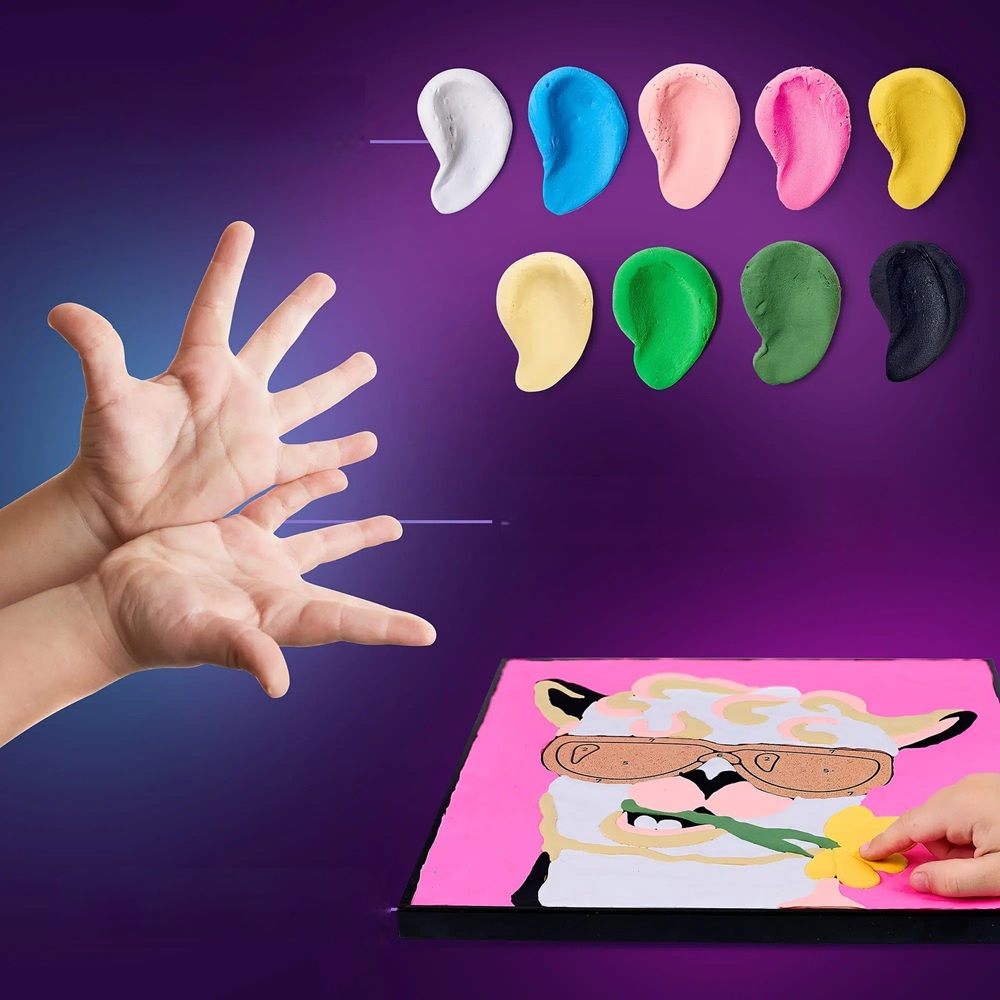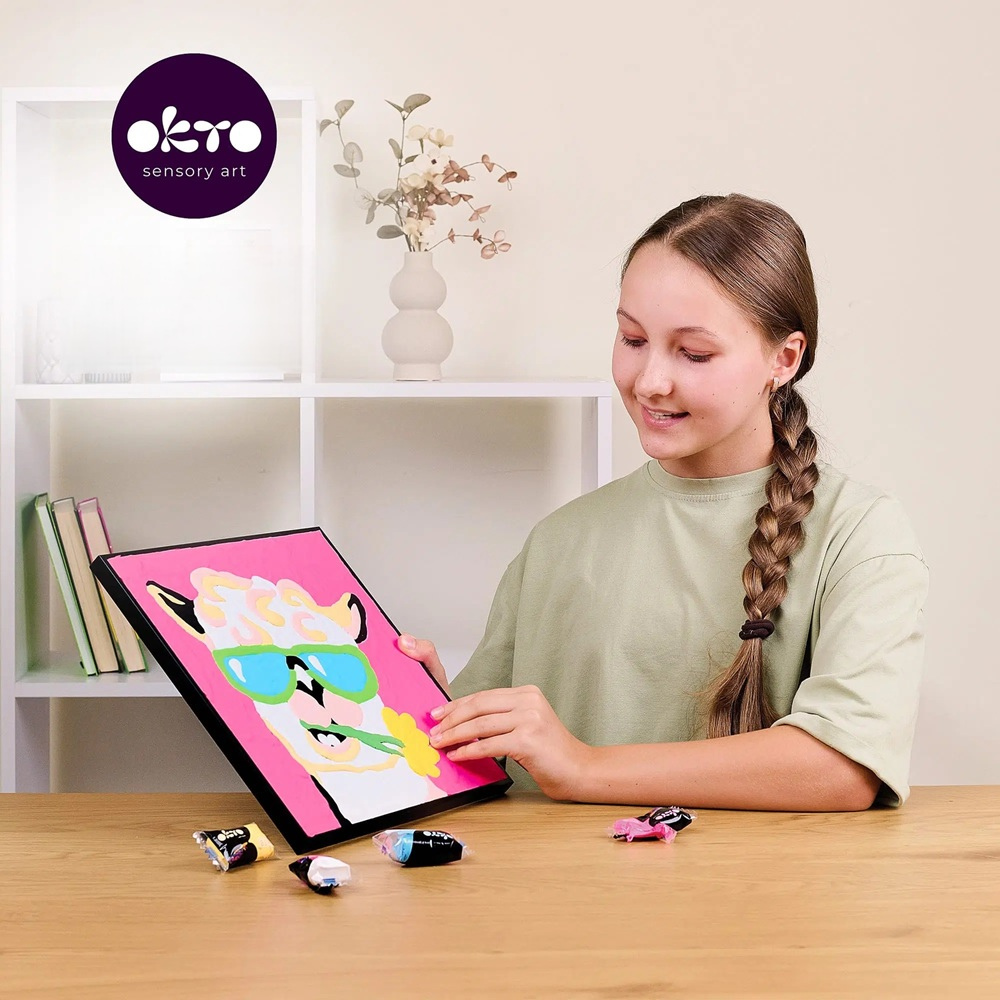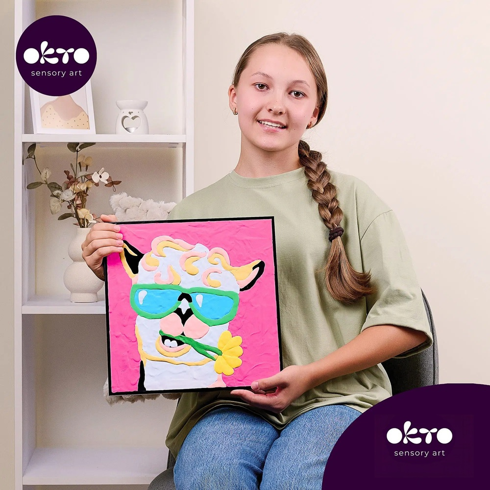 Setul de pictura cu argila usoara OktoClay – Lama este o activitate creativa care imbina joaca si arta intr-un mod simplu si relaxant. Copiii pot realiza un tablou 3D colorat si vesel, modeland personajul preferat din argila usoara, moale si placuta la atingere.