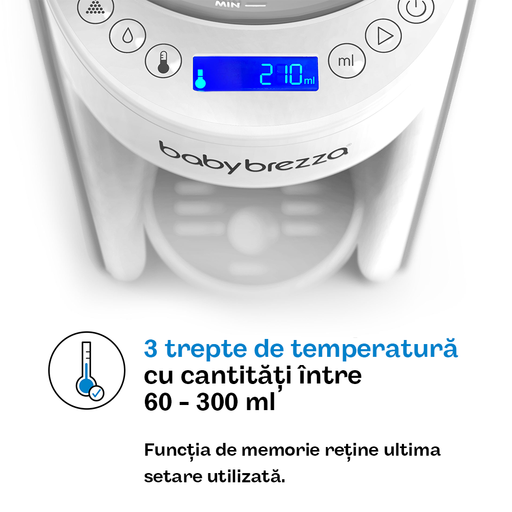 Datorită tehnologiei sale avansate de dozare automată, aparatul amestecă laptele praf și apa cu o precizie perfectă, asigurând consistența optimă a fiecărui biberon. Poți selecta cantitatea dorită între 60 ml și 300 ml (în trepte de 30 ml) și alege dintre 3 niveluri de temperatură – temperatura corpului, mai caldă sau la temperatura camerei.