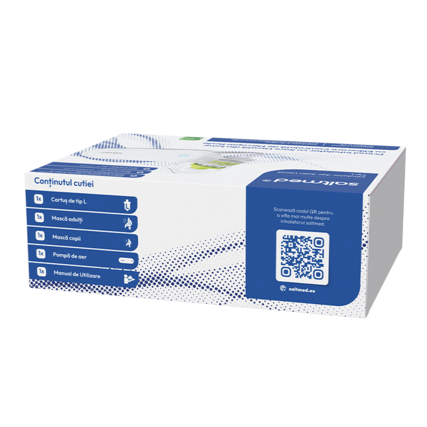 Inhalatorul SaltMed tip L este un dispozitiv destinat utilizării la domiciliu, conceput pentru generarea de aerosoli salini pe bază de microparticule de sare naturală de mină. Acesta contribuie la menținerea confortului respirator și la susținerea funcționării normale a căilor respiratorii, fiind potrivit atât pentru adulți, cât și pentru copii.