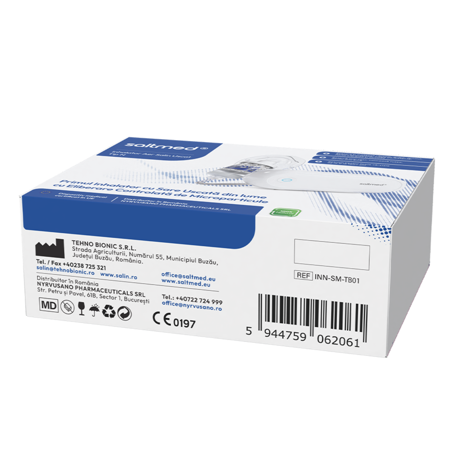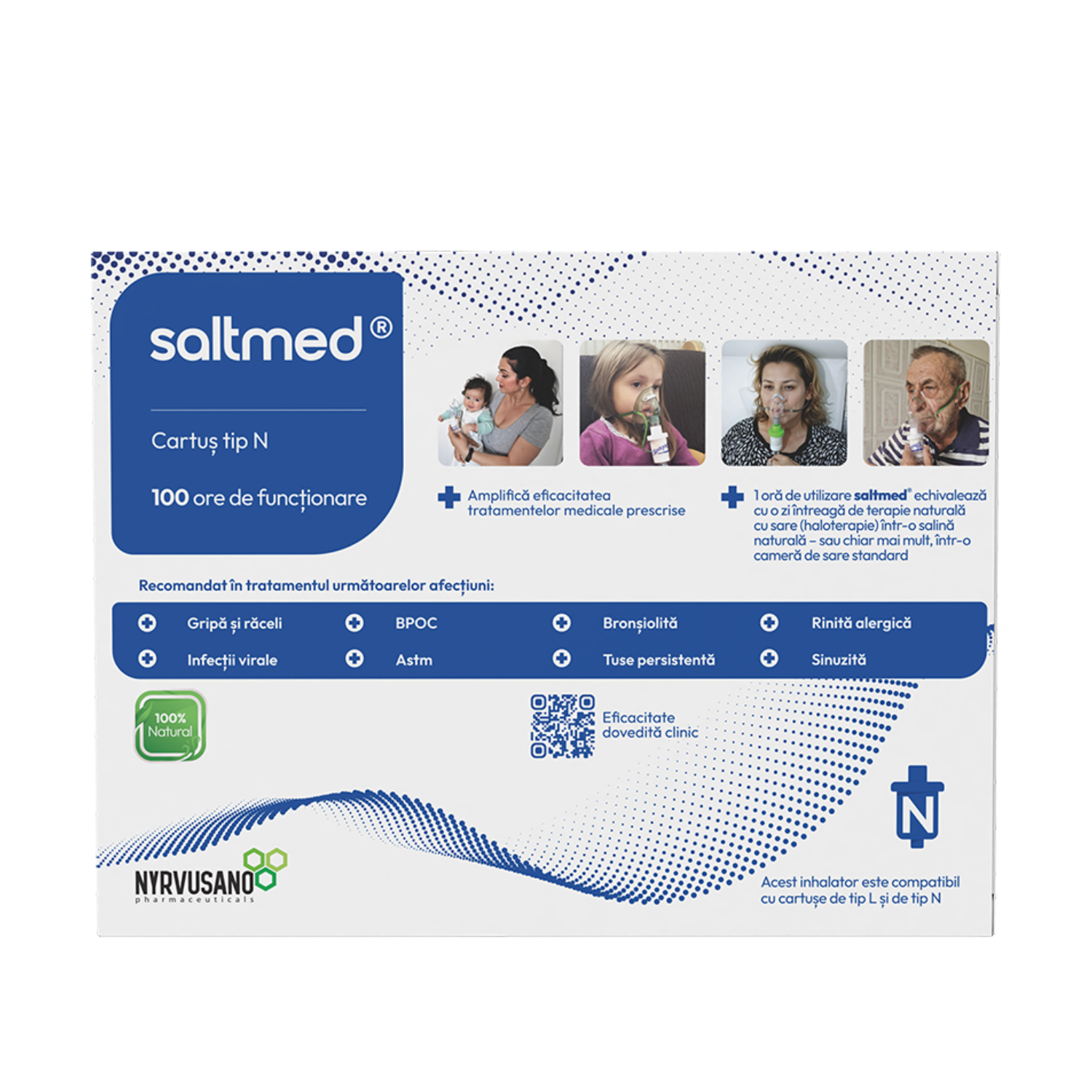 Inhalatorul SaltMed tip N este un dispozitiv destinat utilizării la domiciliu, conceput pentru a genera aerosoli salini pe bază de microparticule de sare naturală de mină. Acesta contribuie la menținerea sănătății căilor respiratorii și la îmbunătățirea confortului respirator, fiind potrivit atât pentru adulți, cât și pentru copii.