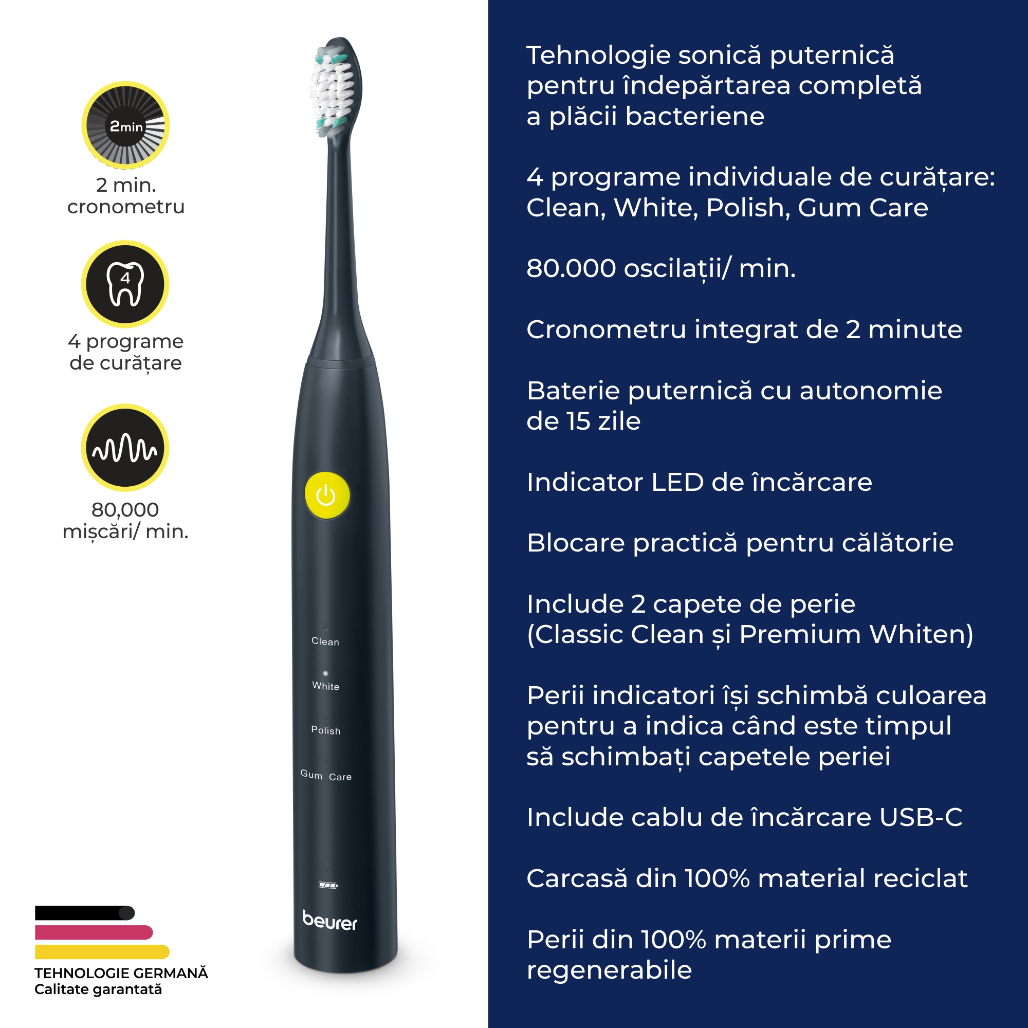 Ultima actualizare a informatiilor de prezentare pentru Periuta de dinti electrica sonica, Jet Black, SC 30, Beurer a fost efectuata la data de 17-04-2026.