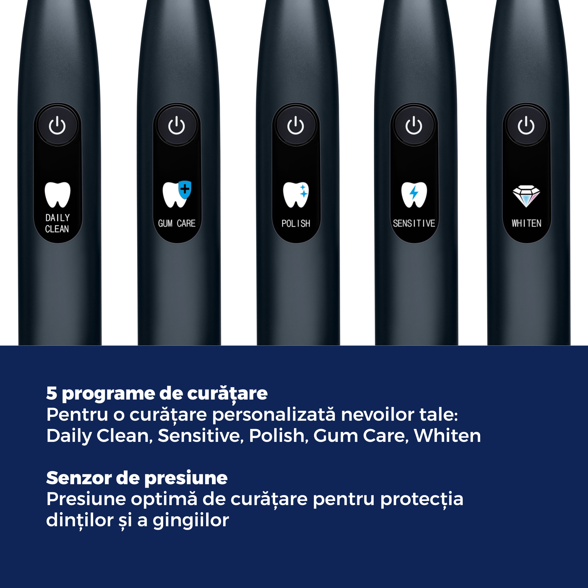 - 5 moduri personalizate de periaj: Alege între Clean, Sensitive, Polish, Gum Care și Whiten – pentru o igienă dentară completă adaptată nevoilor tale.