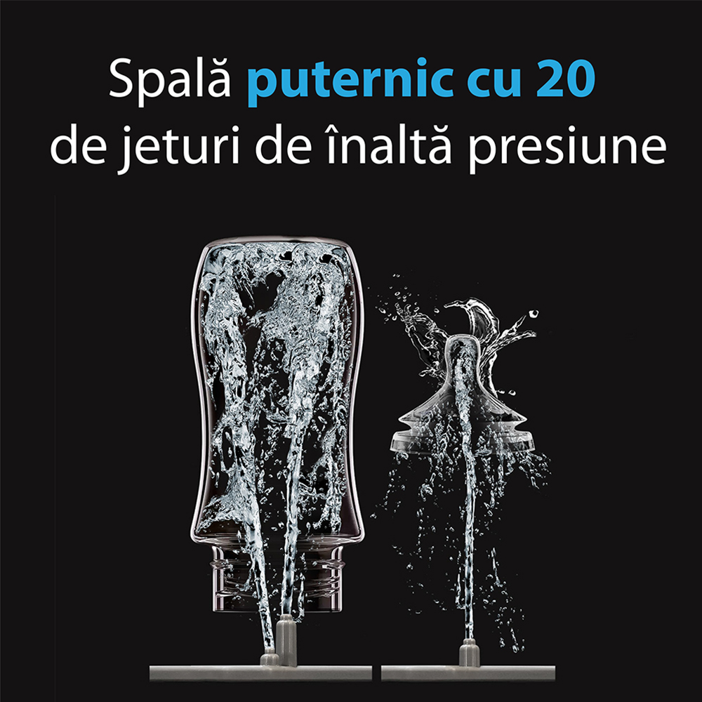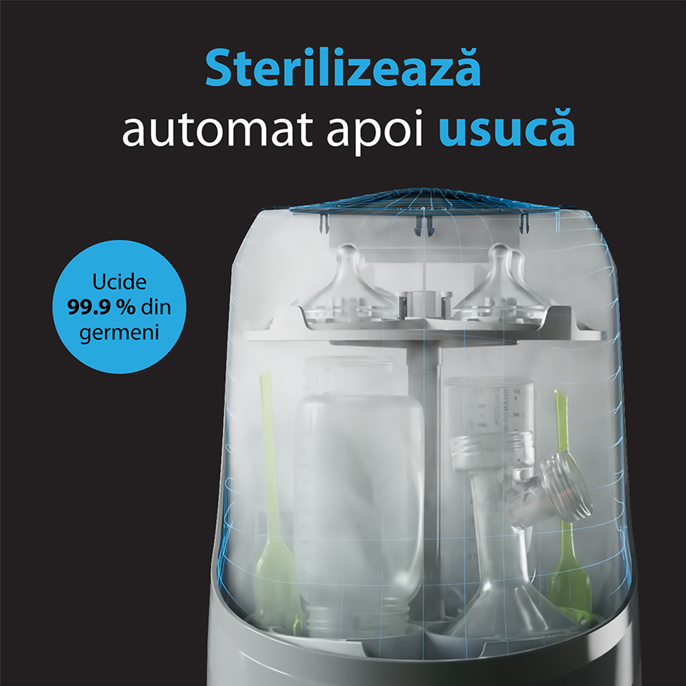 Cu 20 de jeturi de apă de înaltă presiune, aparatul asigură o curățare în profunzime a fiecărui biberon sau accesoriu. Sterilizarea se realizează prin abur natural, eliminând 99,99% dintre germeni, urmată de o uscare completă cu aer cald filtrat HEPA – pentru un mediu igienic și sigur.