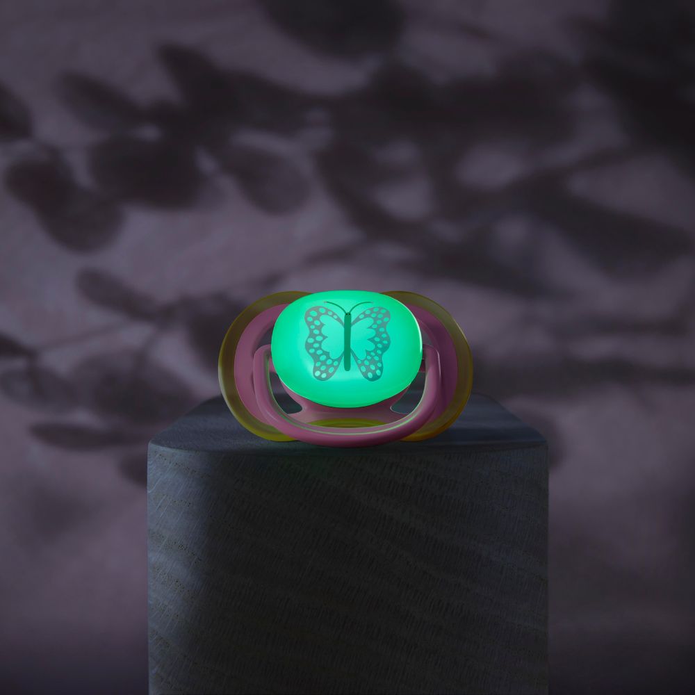 Baza îngustă a tetinei este special creată pentru a diminua presiunea dintre limbă și cerul gurii, iar orificiile din discul de protecție permit pielii bebelușului să respire, menținând-o uscată și confortabilă.