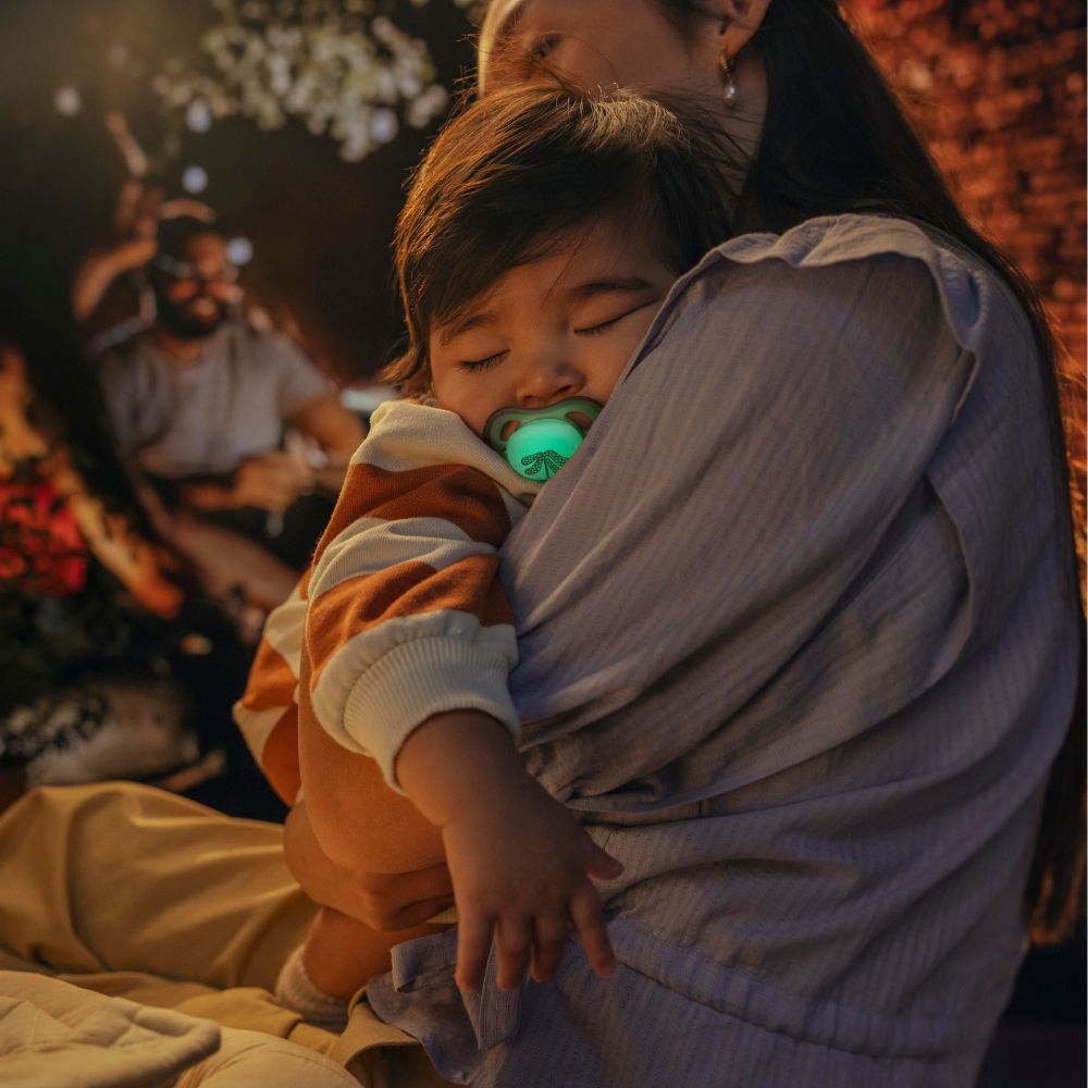 Baza îngustă a tetinei este special creată pentru a diminua presiunea dintre limbă și cerul gurii, iar orificiile din discul de protecție permit pielii bebelușului să respire, menținând-o uscată și confortabilă.