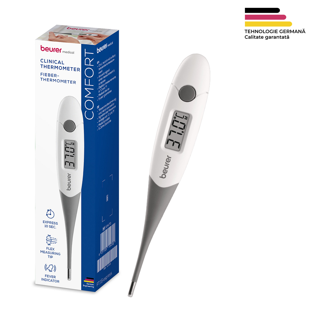 Termometrul FT 16 Expres de la Beurer este un termometru clinic conceput pentru a oferi citiri rapide și precise ale temperaturii corporale, cu un plus de confort. Acest termometru are vârf flexibil, ideal pentru utilizare sigură și delicată, atât pentru adulți, cât și pentru copii.
