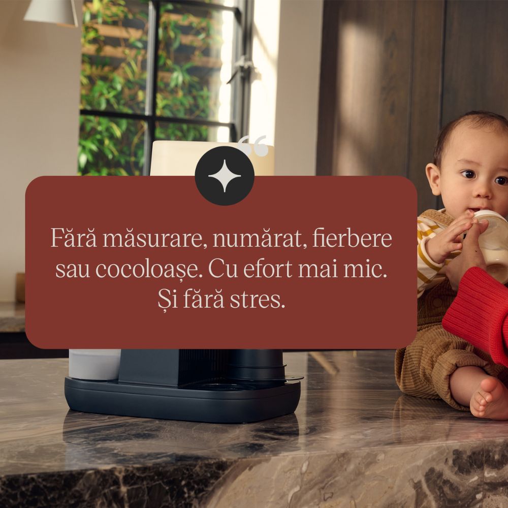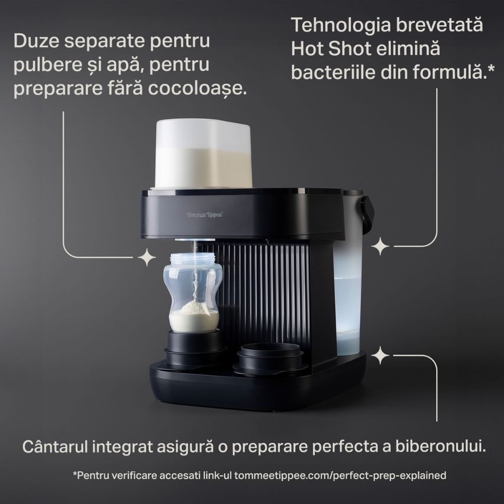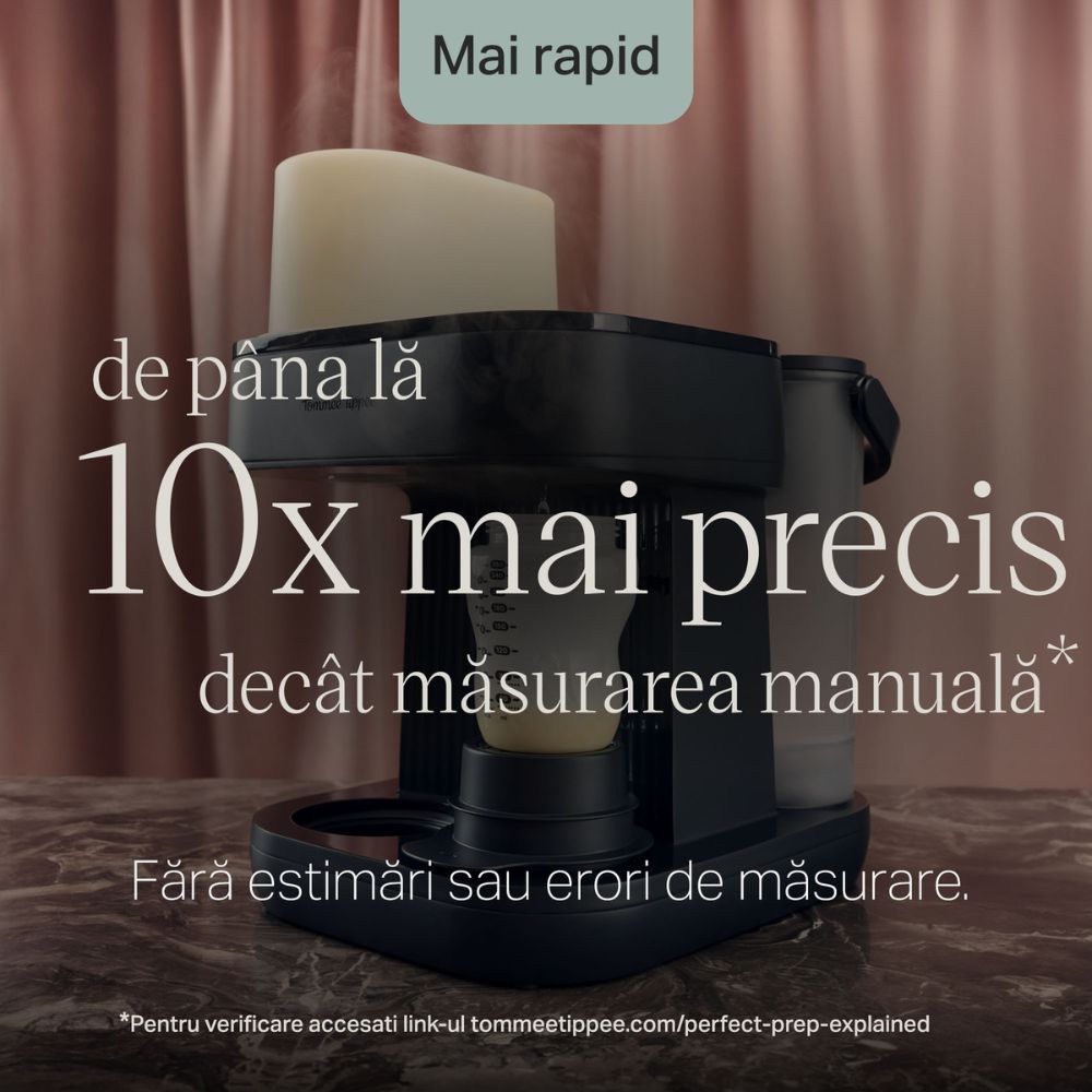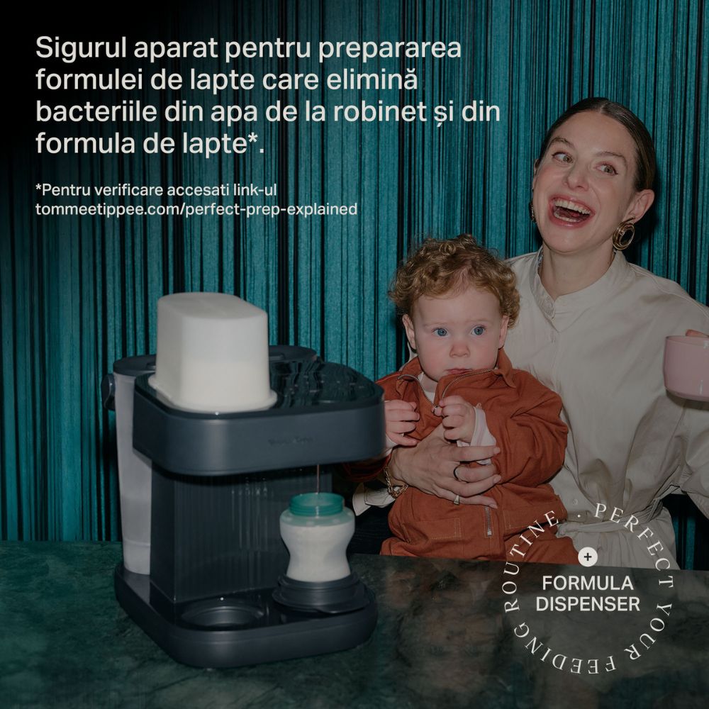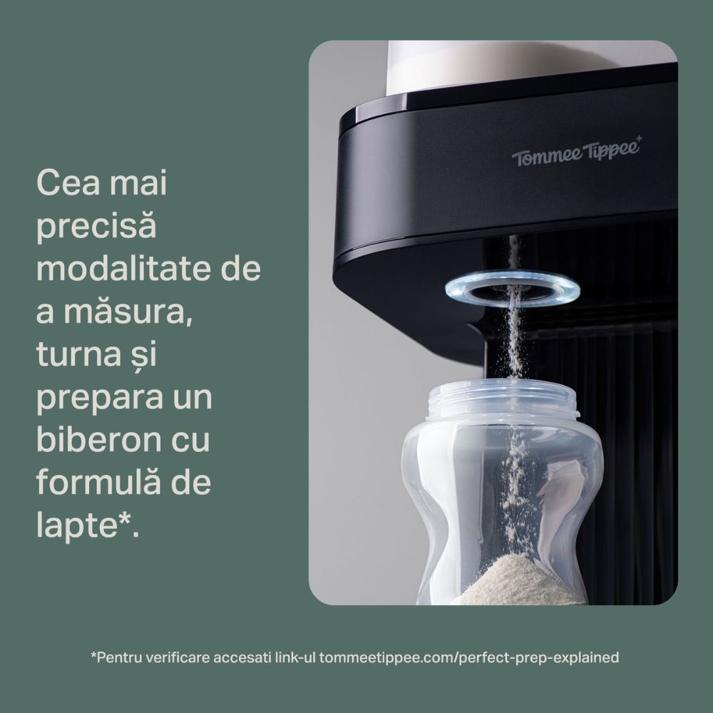 Perfect Prep® Pro asigura un biberon cu formula de lapte la temperatura sigura, precisa si constanta de fiecare data*. Distribuie formula de lapte in doar cateva secunde si elimina bacteriile din apa de la robinet si din formula de lapte*. De pana la 10x mai precis decat masurarea manuala*, este conceput cu un cantar integrat pentru a asigura un amestec perfect de formula si apa de fiecare data. Fara estimari sau erori de masurare.