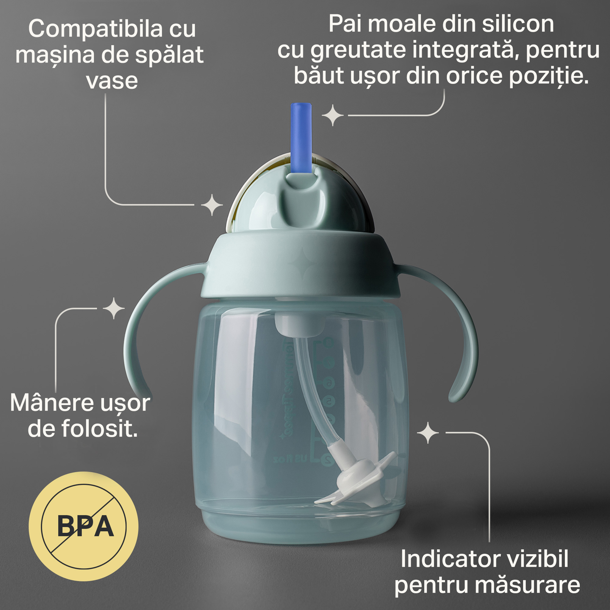 Asamblează cana, introdu paiul ponderat și fixează capacul. Poate fi folosită din orice unghi, fără risc de scurgere. După utilizare, demontează piesele și curăță-le cu peria inclusă sau în mașina de spălat vase.