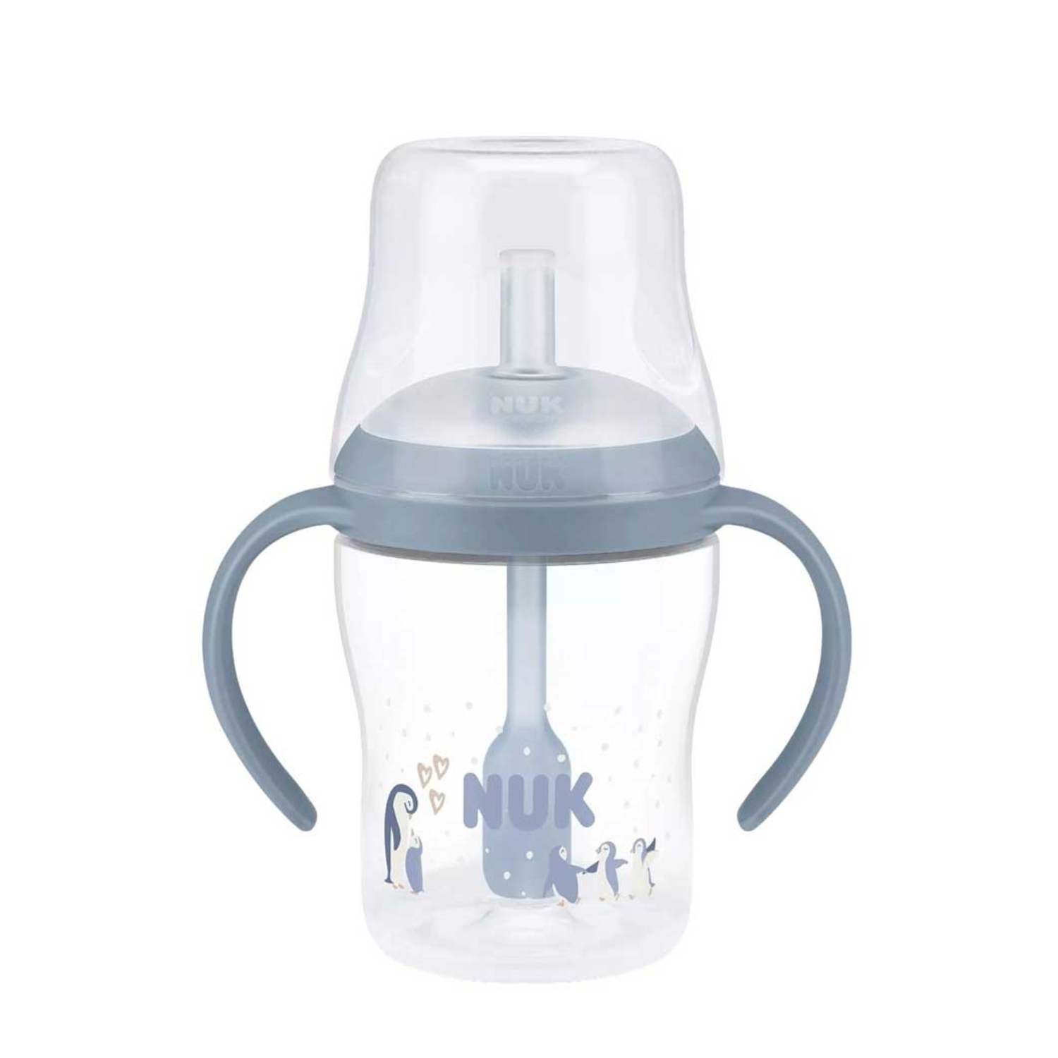 NUK Perfect Match Biberon cu toarte și pai, 150 ml este soluția ideală pentru tranziția naturală de la biberon la cană, ajutând copilul să învețe să bea independent, în mod natural și sigur.