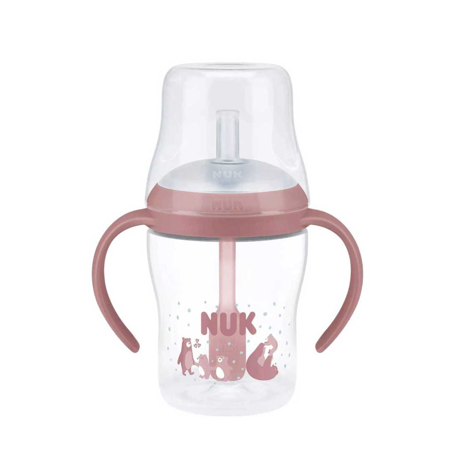 NUK Perfect Match Biberon cu toarte și pai, 150 ml este creat special pentru tranziția naturală de la biberon la cană, sprijinind copilul în dezvoltarea băutului independent.