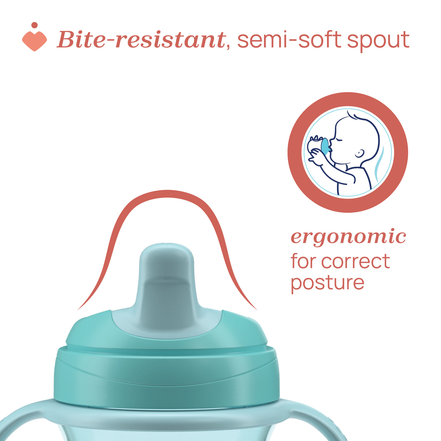 Se foloseste pentru antrenarea treptata a copilului in procesul de baut independent. Cu valva montata previne scurgerile, fara valva permite curgerea libera a lichidului.