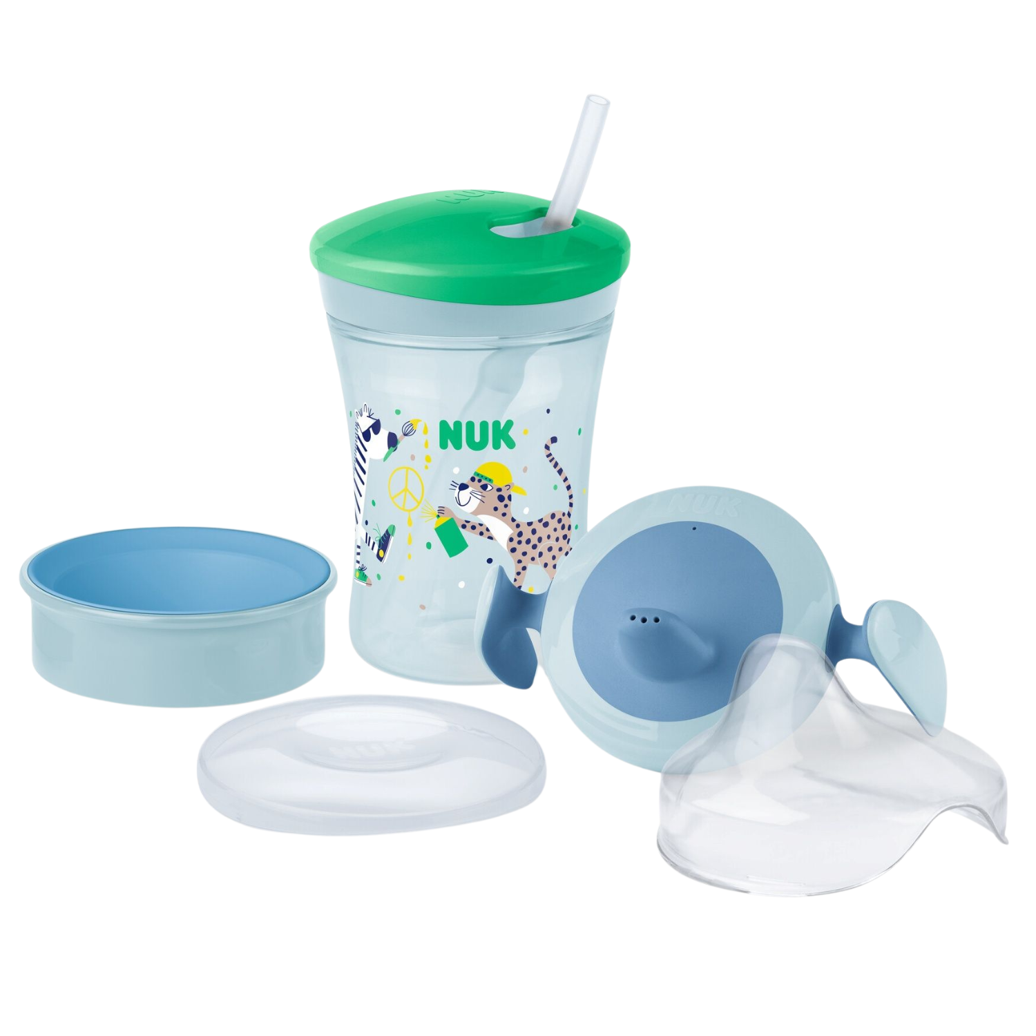 Setul NUK Evolution All-in-1 include 3 tipuri de capace pentru cănile NUK, adaptate fiecărei etape de dezvoltare a copilului: Trainer (6 luni+), Magic (8 luni+) și Action (12 luni+). Această gamă încurajează băutul independent, oferind ajutorul potrivit la momentul potrivit, astfel încât copilul să învețe să bea din cană în mod sigur și distractiv. Cănile sunt rezistente, realizate din polipropilenă fără BPA, cu capace de protecție și mânere ergonomice ușor de ținut de micile mânuțe.