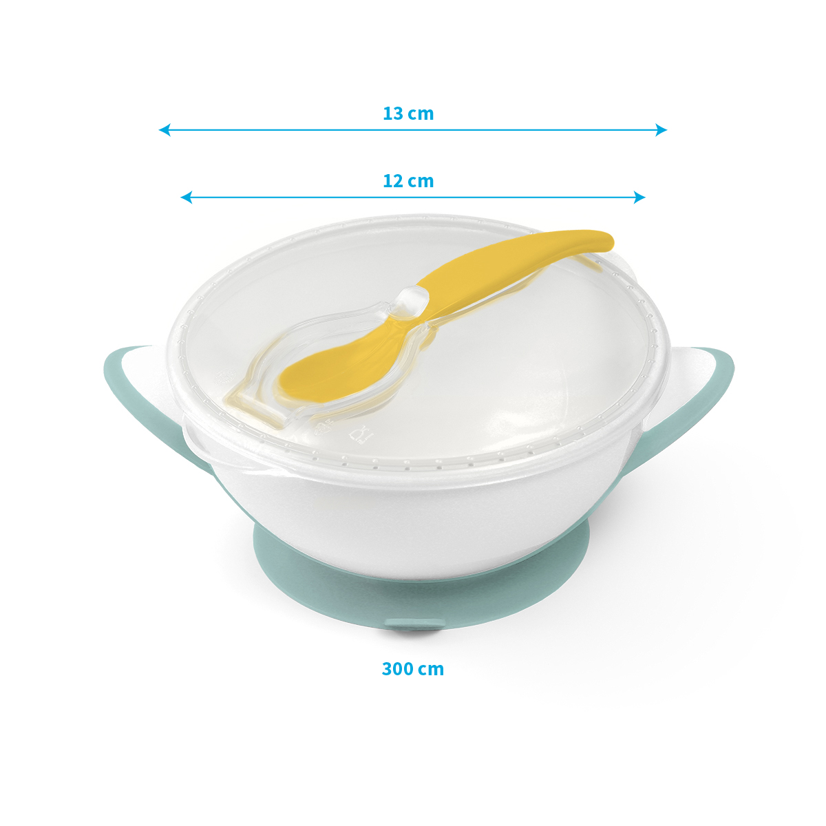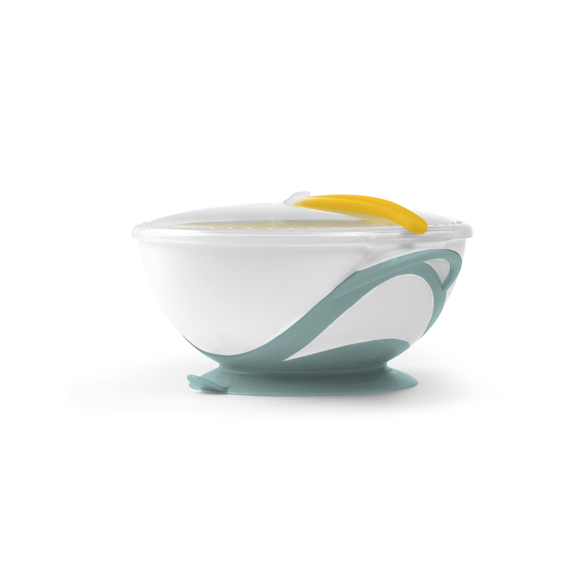 Baza antiderapantă cu ventuză împiedică alunecarea bolului pe suprafeÈ›e, oferind stabilitate în timpul utilizării, iar compartimentul special pentru linguriță previne murdărirea sau pierderea acesteia.