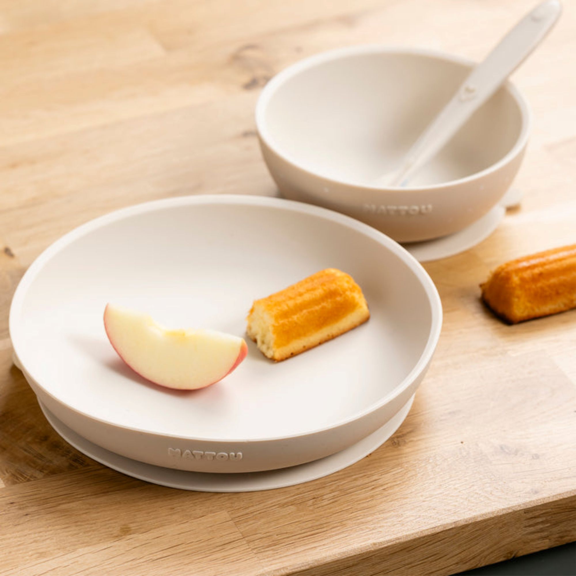 Setul este conceput pentru mesele bebelușilor și copiilor mici, adaptându-se nevoilor lor pe măsură ce cresc — de la primele piureuri (de la 4 luni) până la etapa în care învață să mănânce singuri (12–36 luni). Ventuzele de la baza farfuriei și a castronelului ajută la fixarea pe masă sau pe tava scaunului înalt, reducând riscul de răsturnare. Produsele sunt ușor de depozitat, putând fi așezate unele în altele.