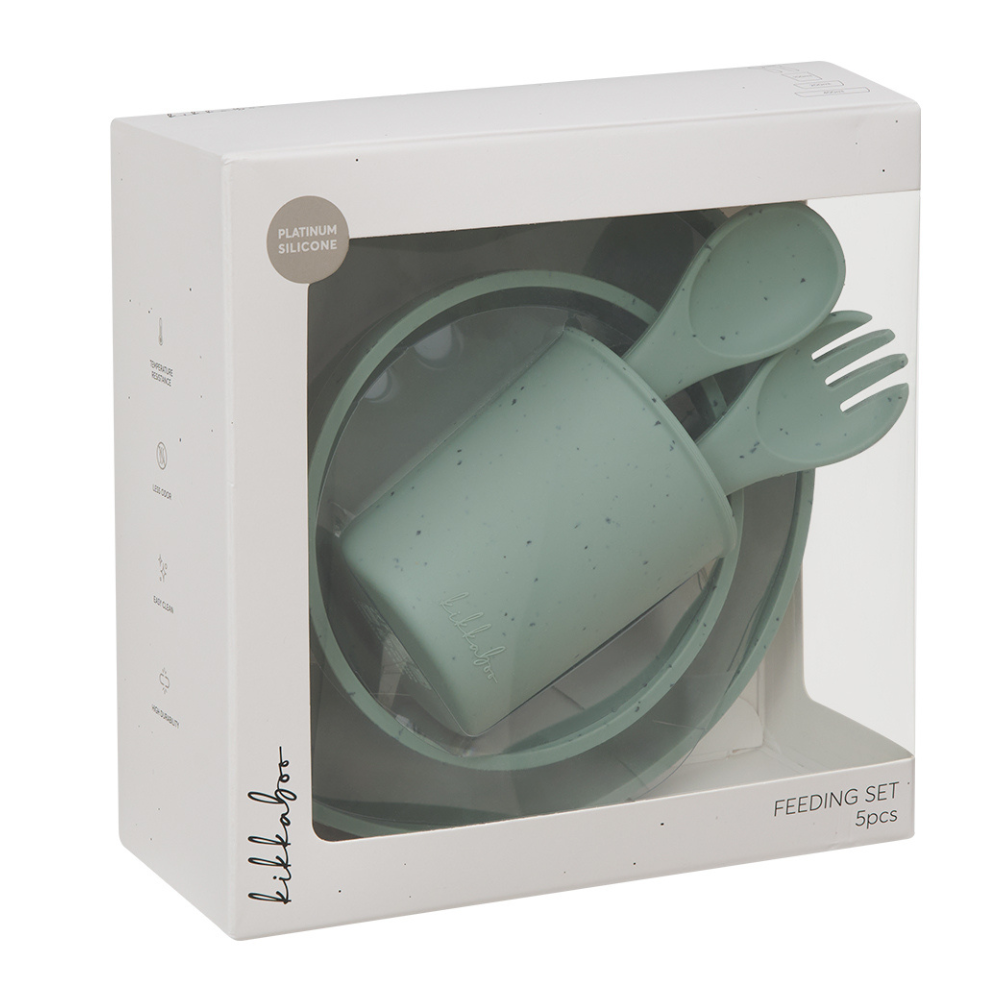 Setul complet din silicon pentru mesele bebelusului, 5 piese, Platinum Sage Green, este alegerea perfecta pentru etapa de diversificare si pentru primele mese independente. Realizat din silicon platinum 100% food-grade, unul dintre cele mai sigure materiale din industria alimentara, setul ofera durabilitate, flexibilitate si confort maxim la fiecare utilizare. Piesele sunt rezistente la temperaturi extreme, nu retin mirosuri, nu se pateaza si se curata foarte usor, fiind compatibile cu masina de spalat vase, cuptorul cu microunde, sterilizatorul si congelatorul. Include farfurie, bol, canuta, lingurita si furculita, special concepute pentru a sprijini hranirea autonoma si obiceiurile alimentare sanatoase.