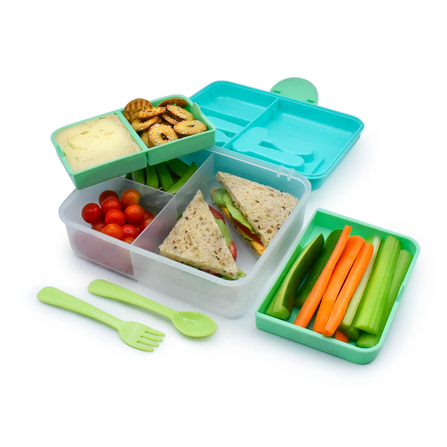 Include lingura si furculita integrate, cu spatiu dedicat in capac