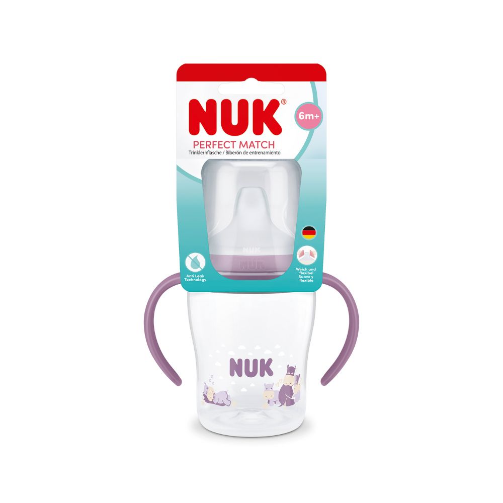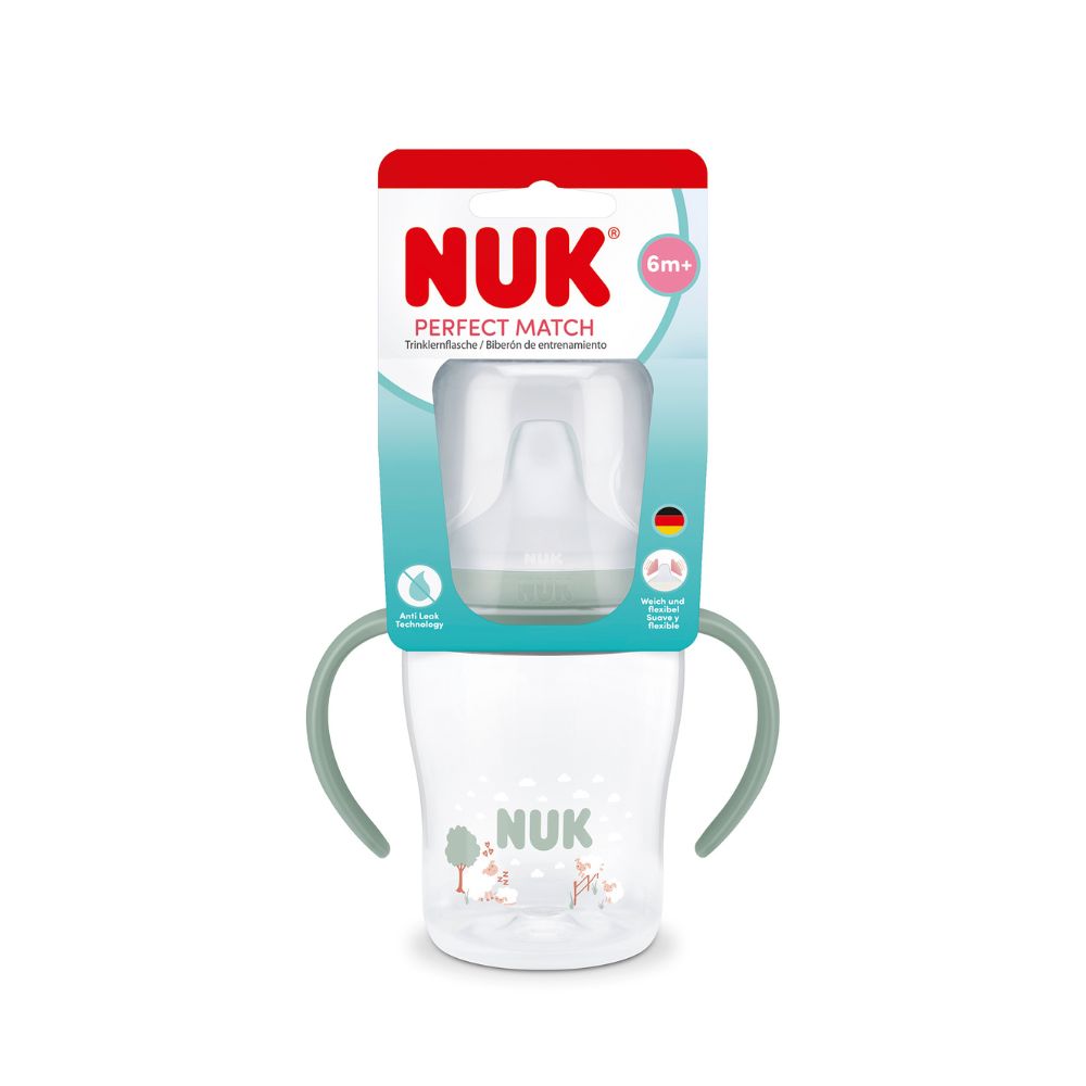 NUK Perfect Match Biberon cu Toarte, 150 ml, de la 6 luni – model asortat, este conceput pentru a facilita tranziția naturală de la biberon la cană și pentru a susține dezvoltarea independenței bebelușului.