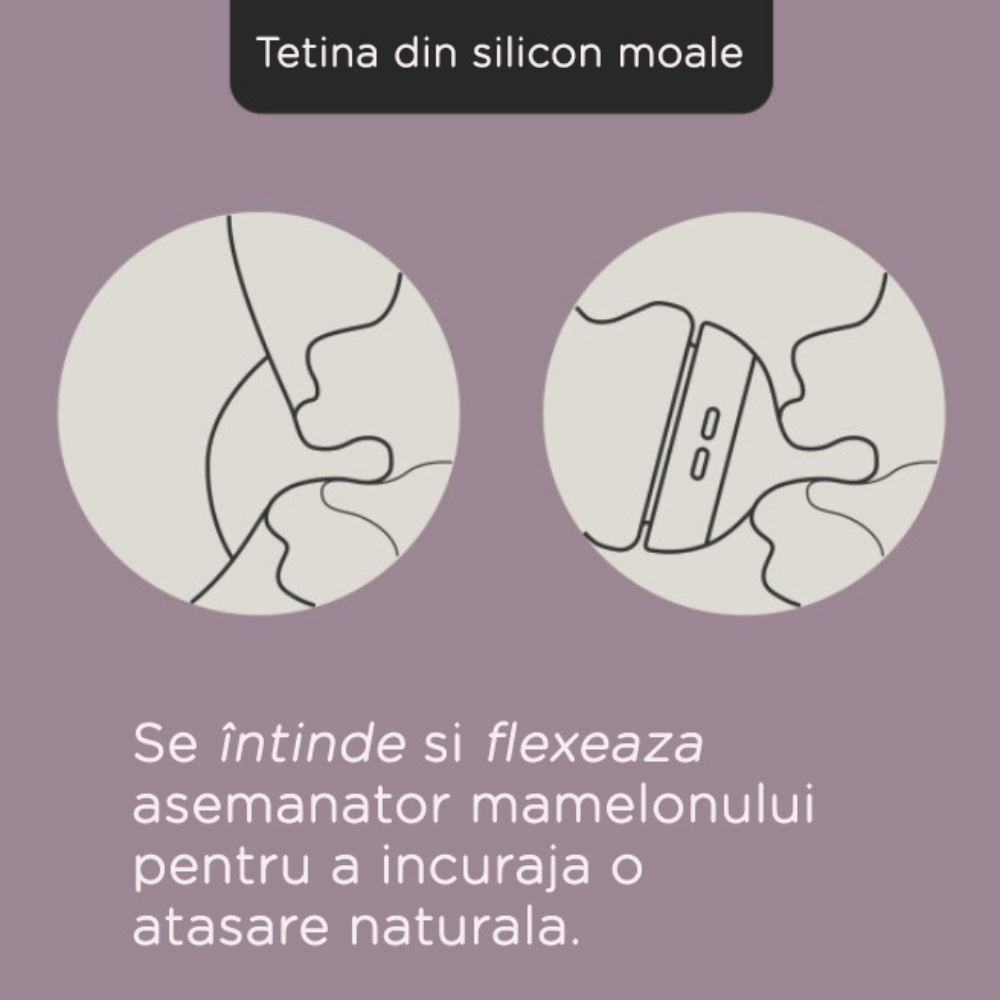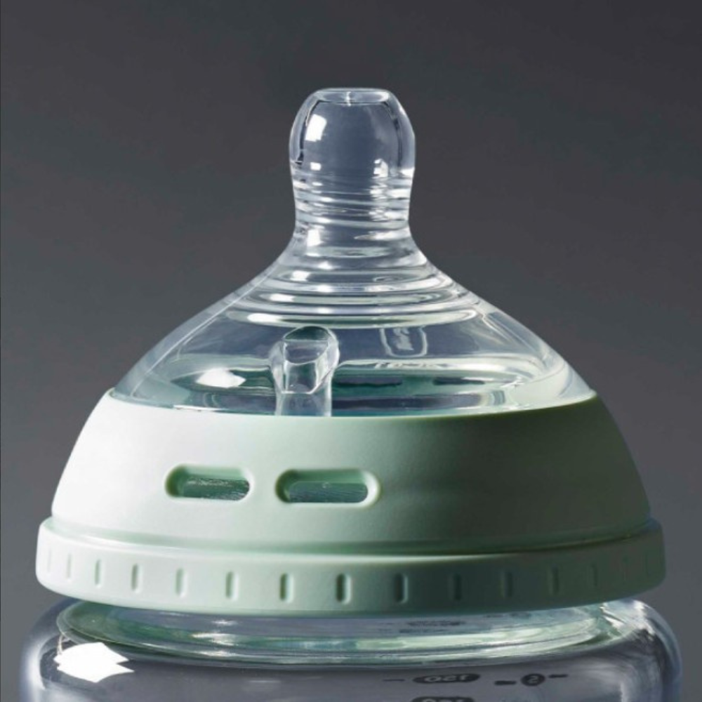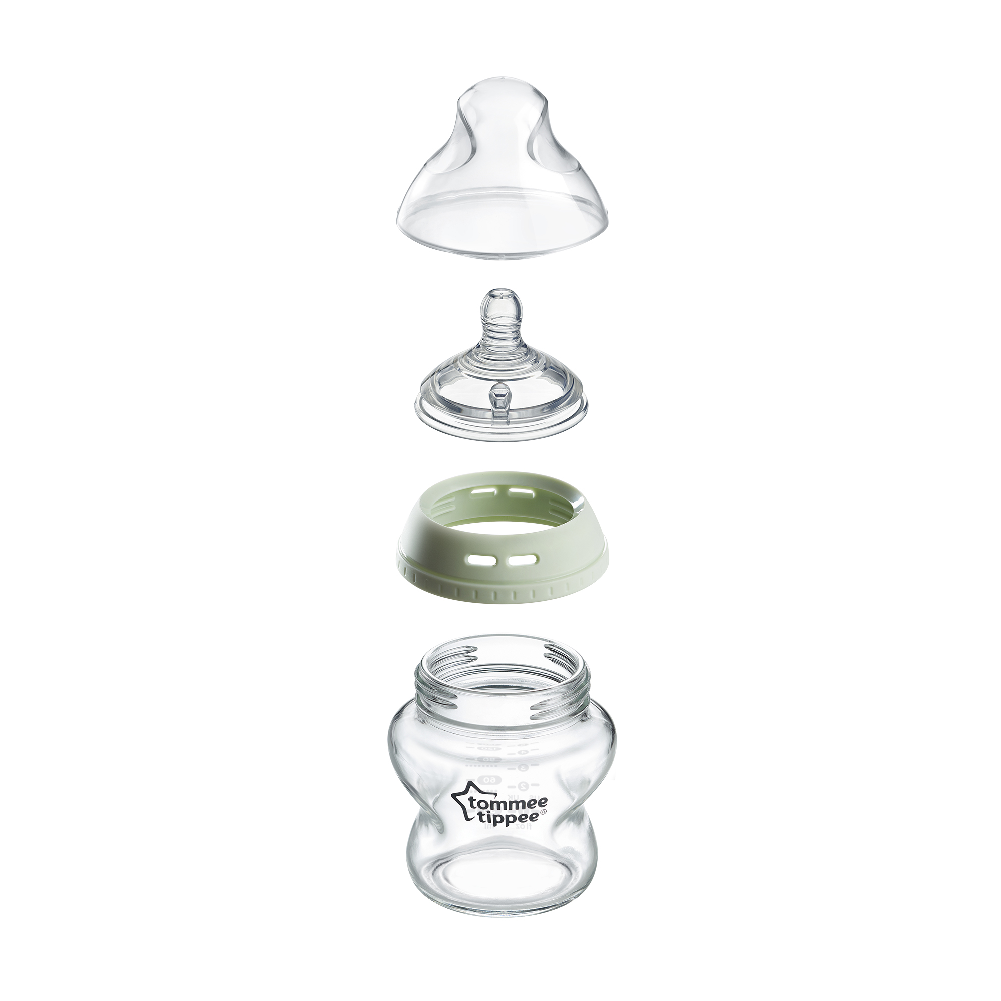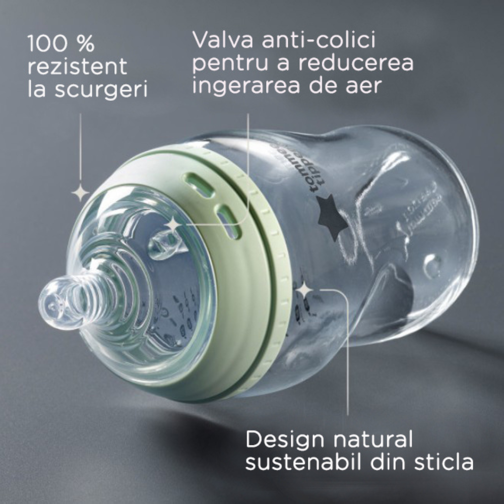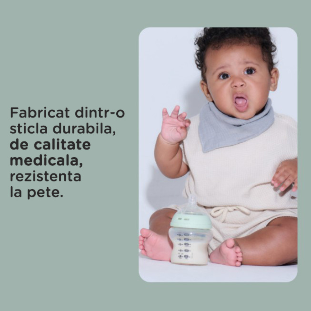 Biberonul de sticla Tommee Tippee Natural Start, 150 ml, este conceput pentru a sustine hranirea naturala a bebelusilor inca din primele zile de viata. Tetina moale din silicon, cu forma asemanatoare sanului si flux lent, faciliteaza alternarea hranirii la san cu hranirea la biberon, reducand riscul de confuzie a mamelonului. Fabricat din sticla borosilicata durabila, fara BPA si alte substante nocive, biberonul ofera siguranta, rezistenta si o experienta de hranire confortabila. Functia de auto-sterilizare in cuptorul cu microunde aduce un plus de practicitate pentru parinti.