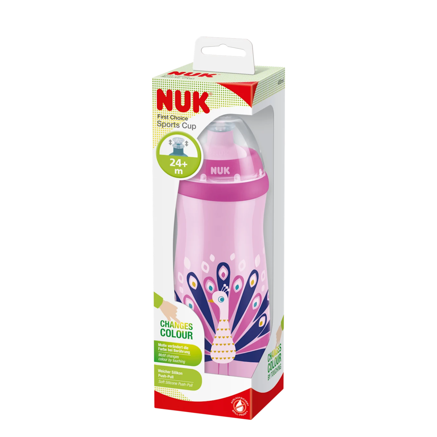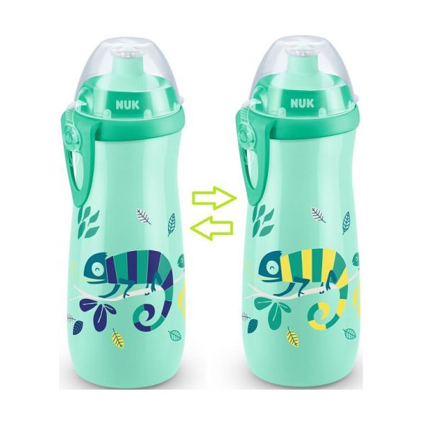 Cana Sport NUK Color Change (Efect Cameleon) transformă hidratarea zilnică într-o experiență distractivă și interactivă pentru copii. Elementele grafice își schimbă culoarea în funcție de temperatura lichidului – cald sau rece – captivând atenția celor mici și stimulând interesul pentru consumul de lichide.
