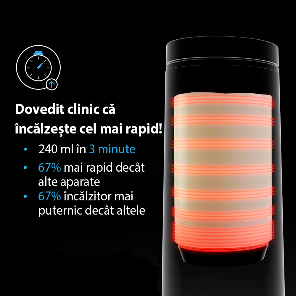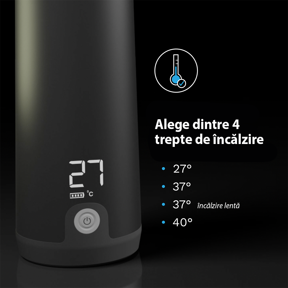 Încălzește lichidele cu până la 67% mai rapid decât alte modele portabile – un biberon de 240 ml ajunge de la temperatura camerei la temperatura corpului în doar 3 minute. Dispune de 4 setări de temperatură (27°C, 37°C, 40°C și 37°C pentru încălzire lentă a laptelui matern), oferind control precis pentru fiecare tip de lichid.