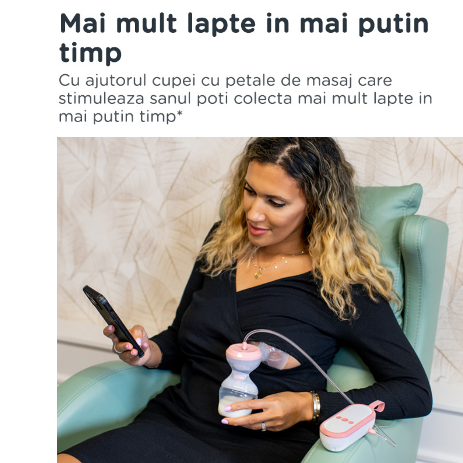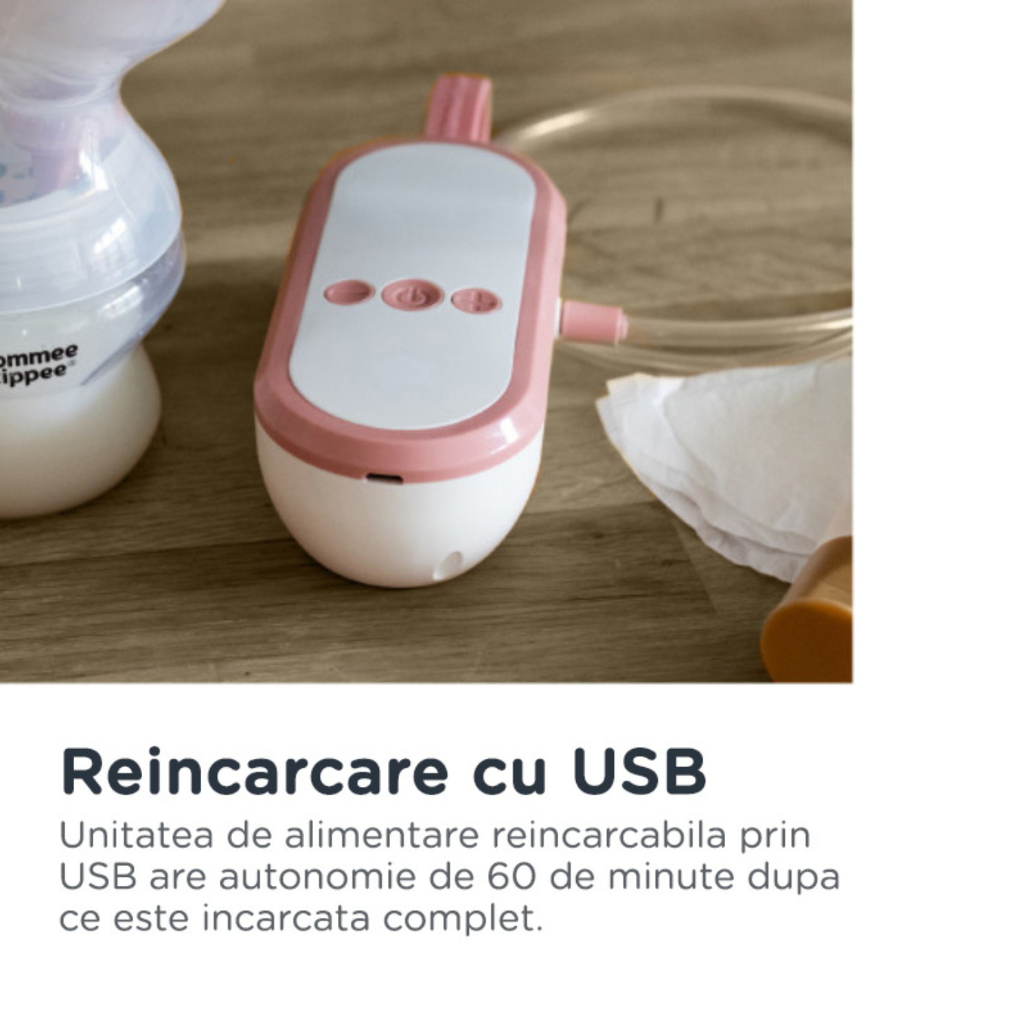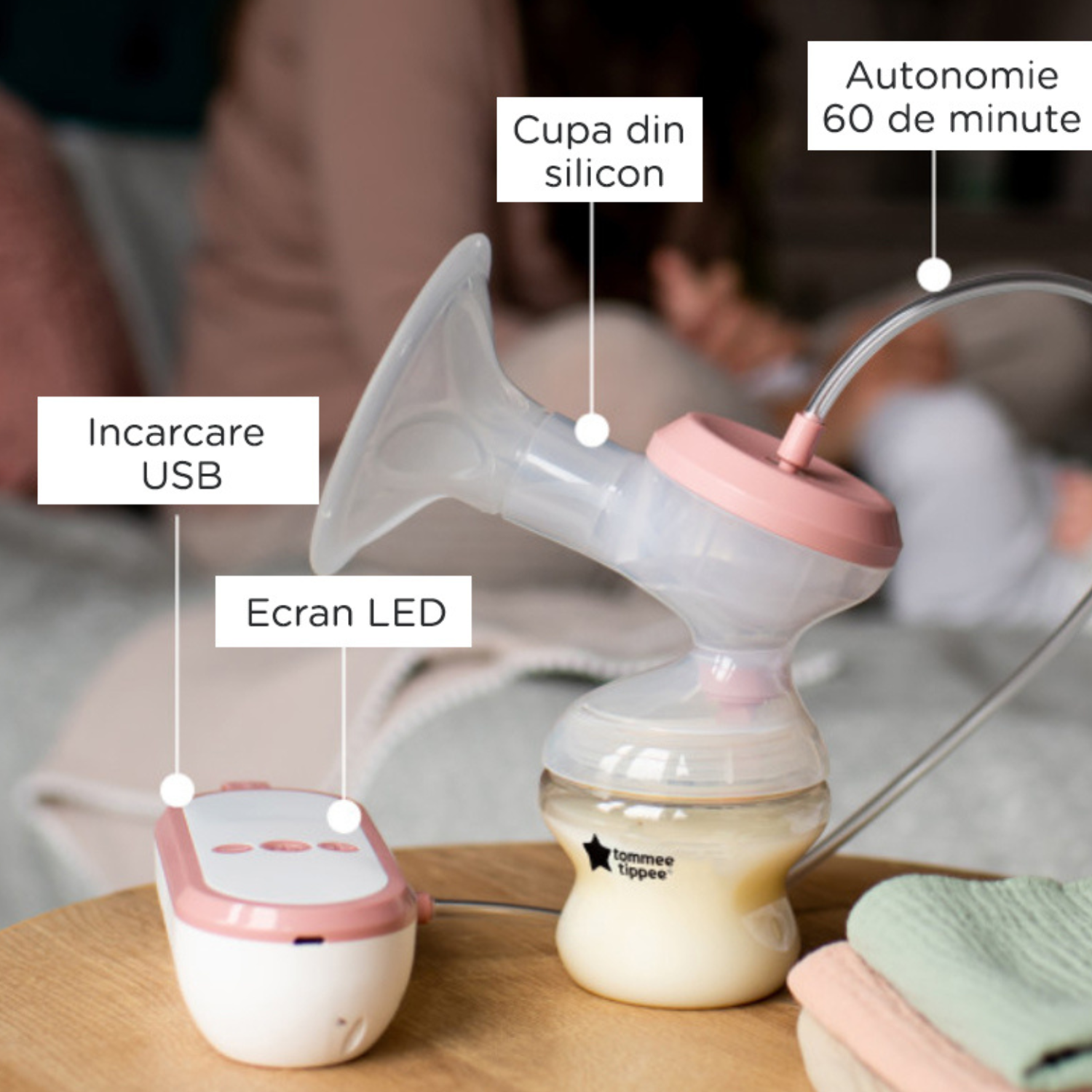 Pompa electrică Tommee Tippee Made for Me este concepută pentru mamele care doresc confort, discreție și eficiență în timpul alăptării. Dotată cu o cupă moale din silicon cu petale de masaj, aceasta stimulează delicat sânii pentru a colecta mai mult lapte în mai puțin timp. Este reîncărcabilă prin USB, ușor de transportat, silențioasă și ideală pentru utilizare acasă sau în deplasare. Include un biberon Closer to Nature de 150 ml și un ecran LED care indică timpul de colectare.