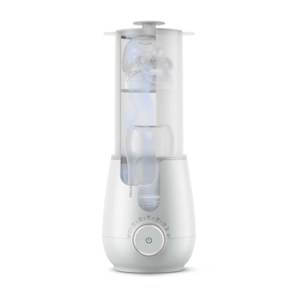 - Sterilizare eficientă 99,9% – Aburul natural elimină germenii și bacteriile fără substanțe chimice, fiind sigur pentru biberoane, suzete și accesorii mici.