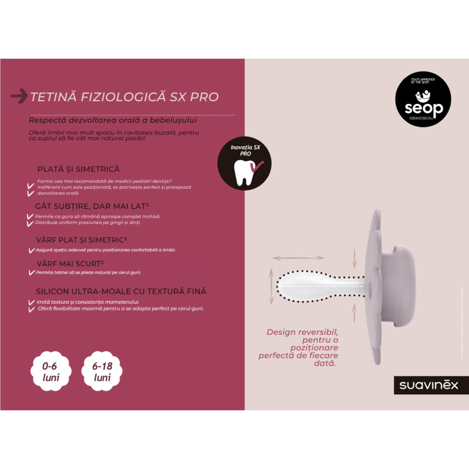 Descoperiți noul model de suzetă cu scut convex și tetină fiziologică SX Pro, recomandată atât de ortodonți pediatri cât și de stomatologi pediatri. Această suzetă respectă dezvoltarea naturală a cavității bucale a copilului și a primit aprobarea Societății Spaniole de Stomatologie Pediatrică și Asociației Ortodonților Specialiști din Italia.