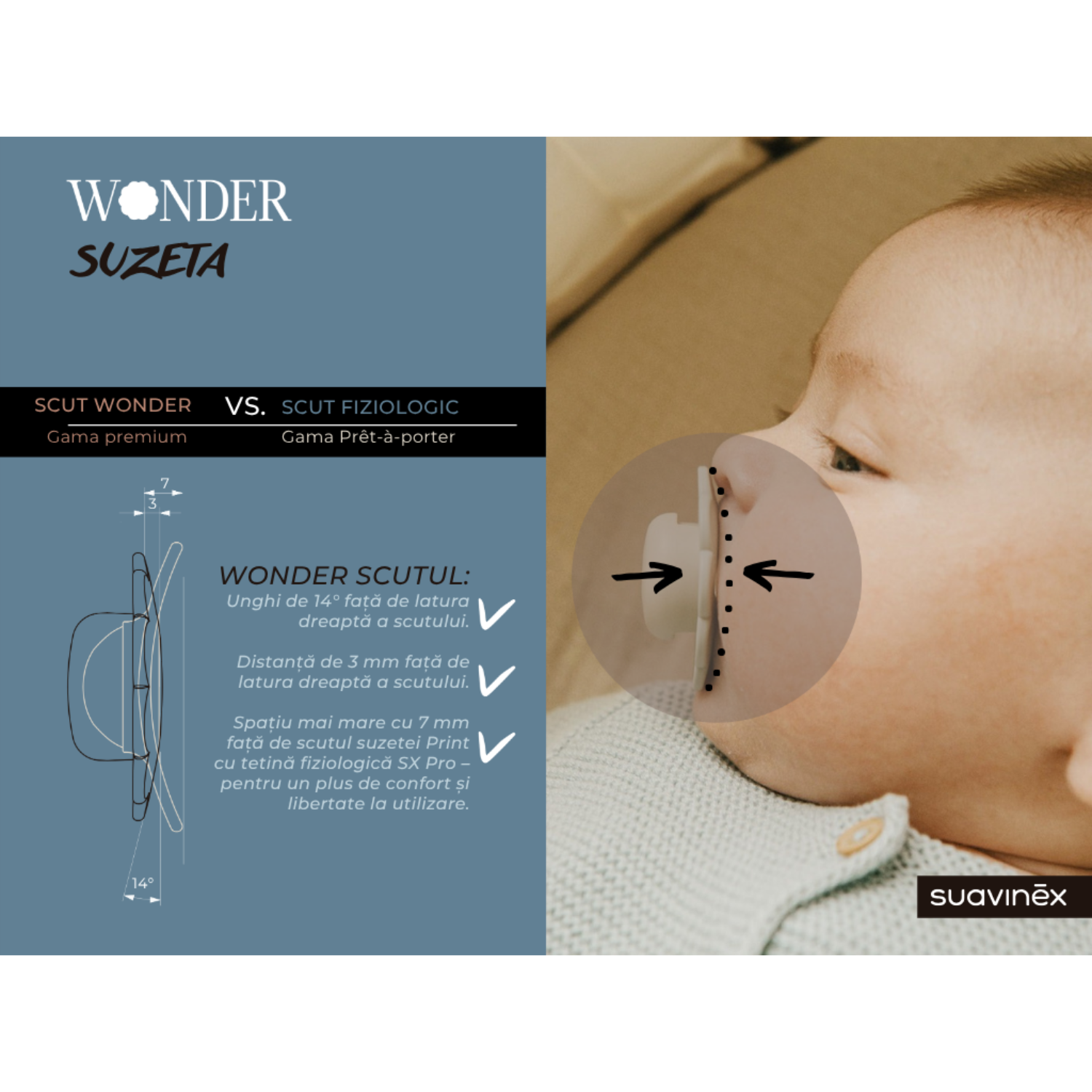 Descoperiți noul model de suzetă cu scut convex și tetină fiziologică SX Pro, recomandată atât de ortodonți pediatri cât și de stomatologi pediatri. Această suzetă respectă dezvoltarea naturală a cavității bucale a copilului și a primit aprobarea Societății Spaniole de Stomatologie Pediatrică și Asociației Ortodonților Specialiști din Italia.