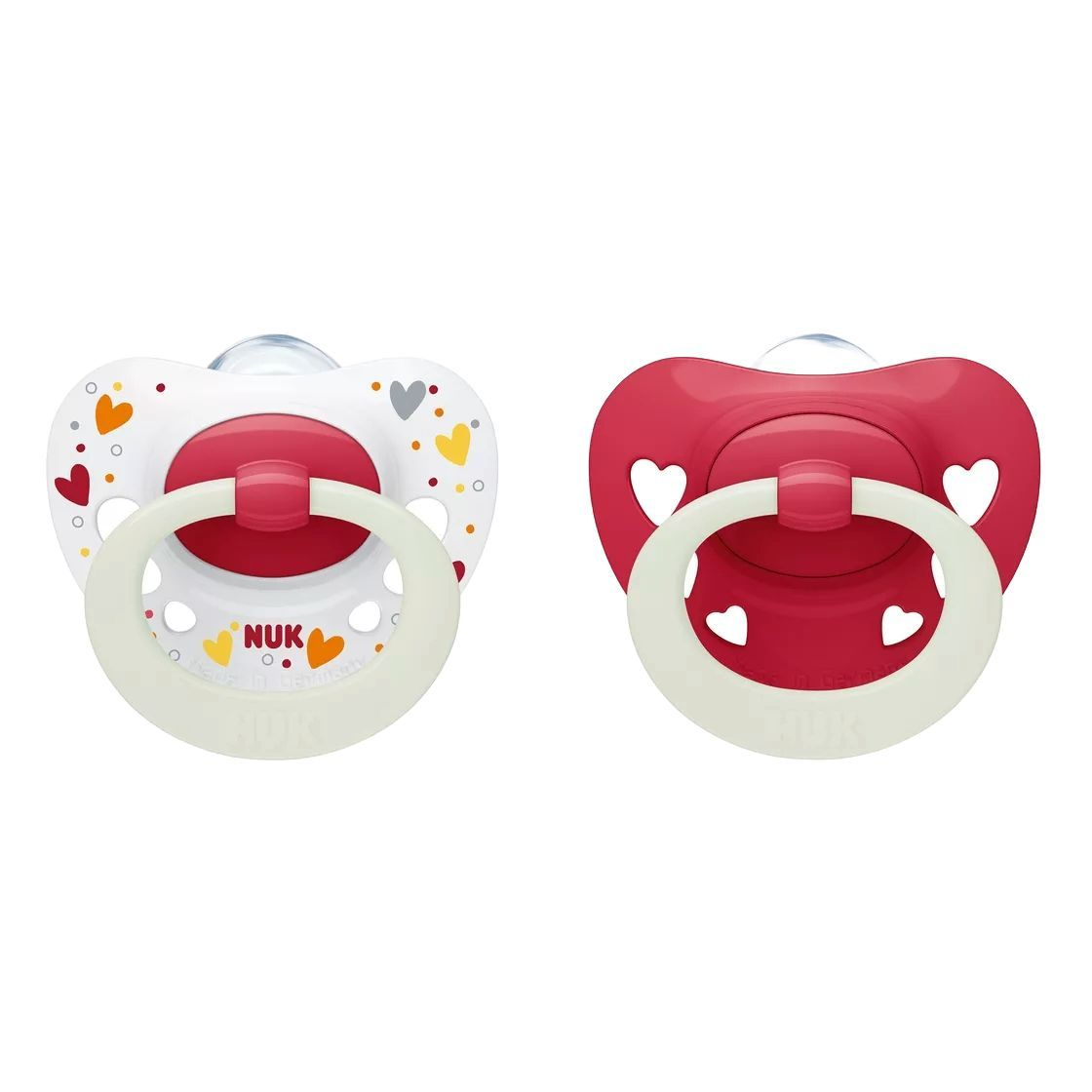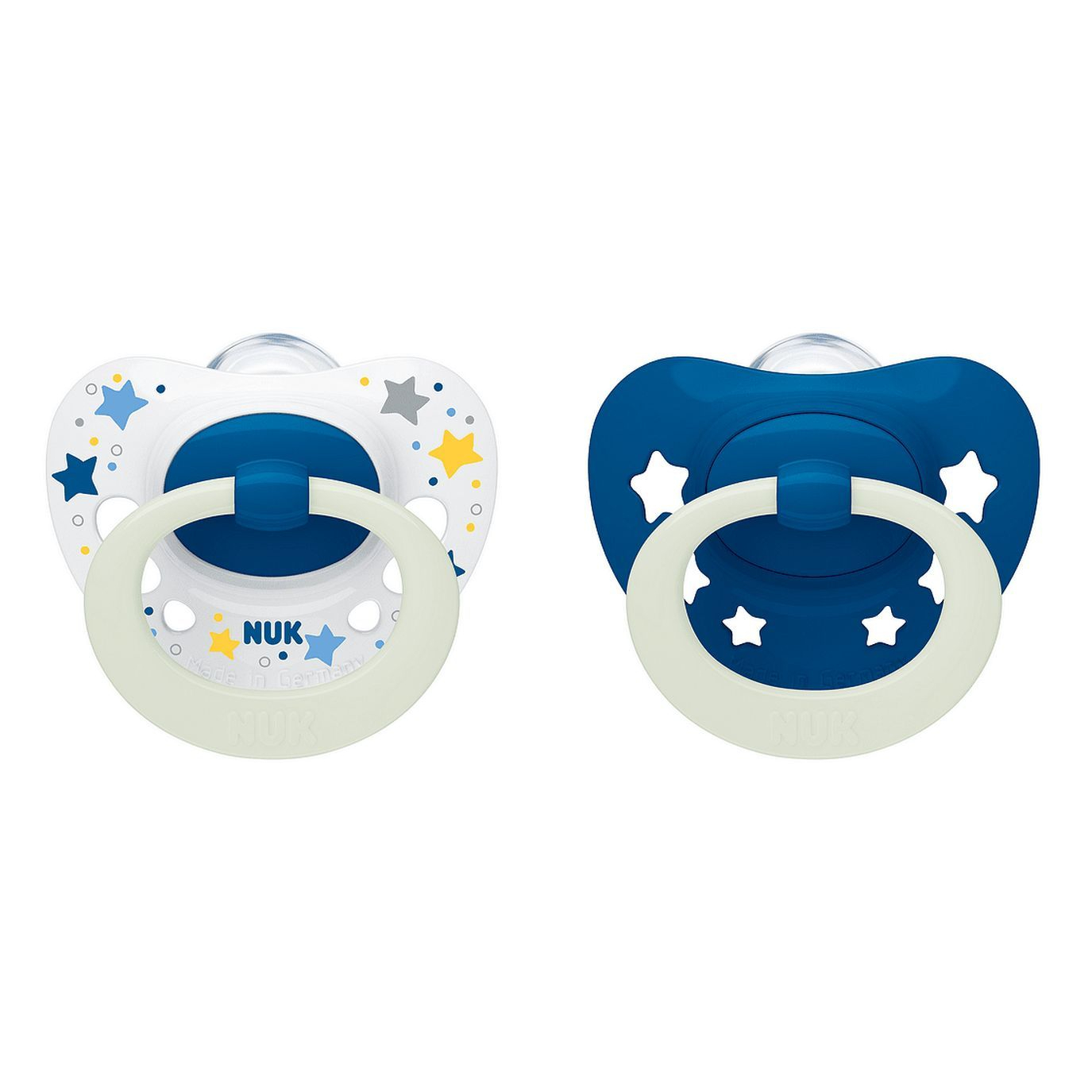 Datorită unui material ce luminează, sigur pentru copii, suzetele strălucesc discret în întuneric și pot fi ușor găsite chiar și noaptea.