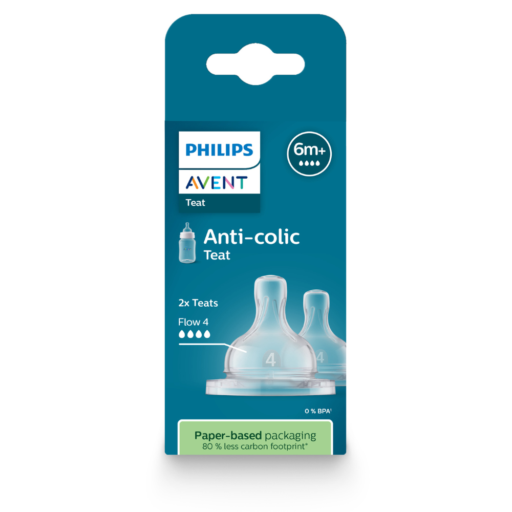 Tetinele anti-colici Philips Avent sunt disponibile cu debite diferite, pentru a ţine pasul cu creşterea bebeluşului. Recomandăm înlocuirea tetinelor la fiecare 3 luni din motive de igienă.